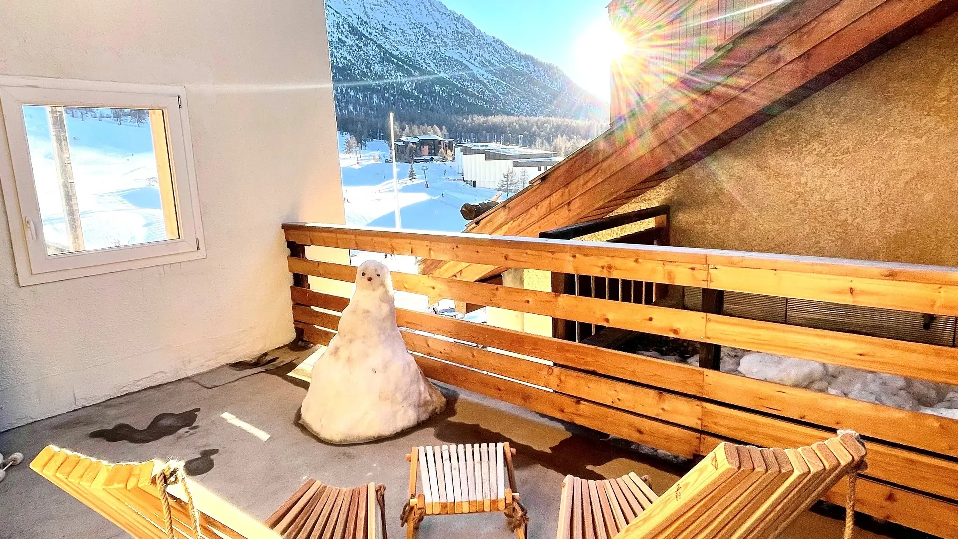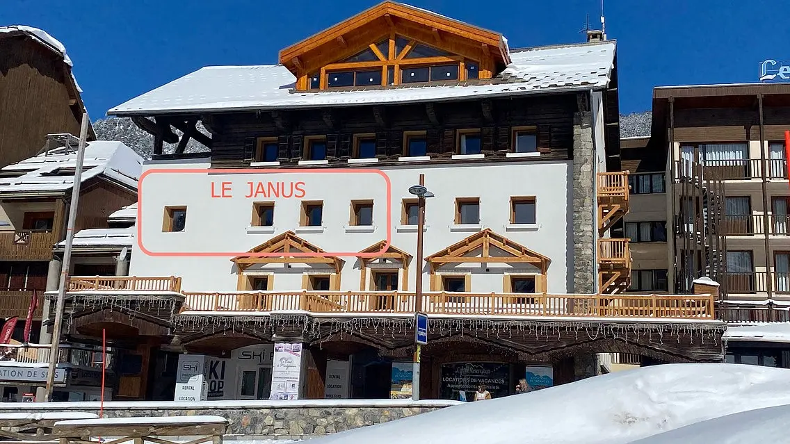 LE JANUS: Luxury apartment for 7 people (4 adults and 3 children) ideally located on the snow front, in the center of the resort (just in front ESF and Tourism Office building). Large living room, 3 bedrooms, 2 bathrooms, balcony with private sauna, ski locker with boot dryer and 2 garages.