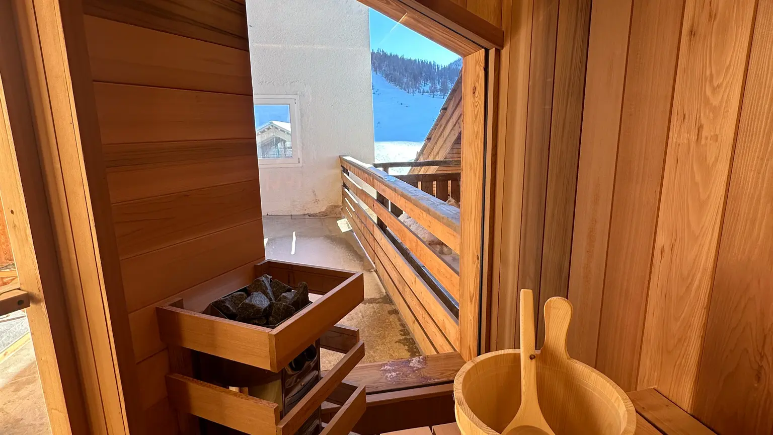 Large living room - 3 bedrooms - 2 bathrooms - balcony with private sauna - private ski locker with boot and glove dryer - garages