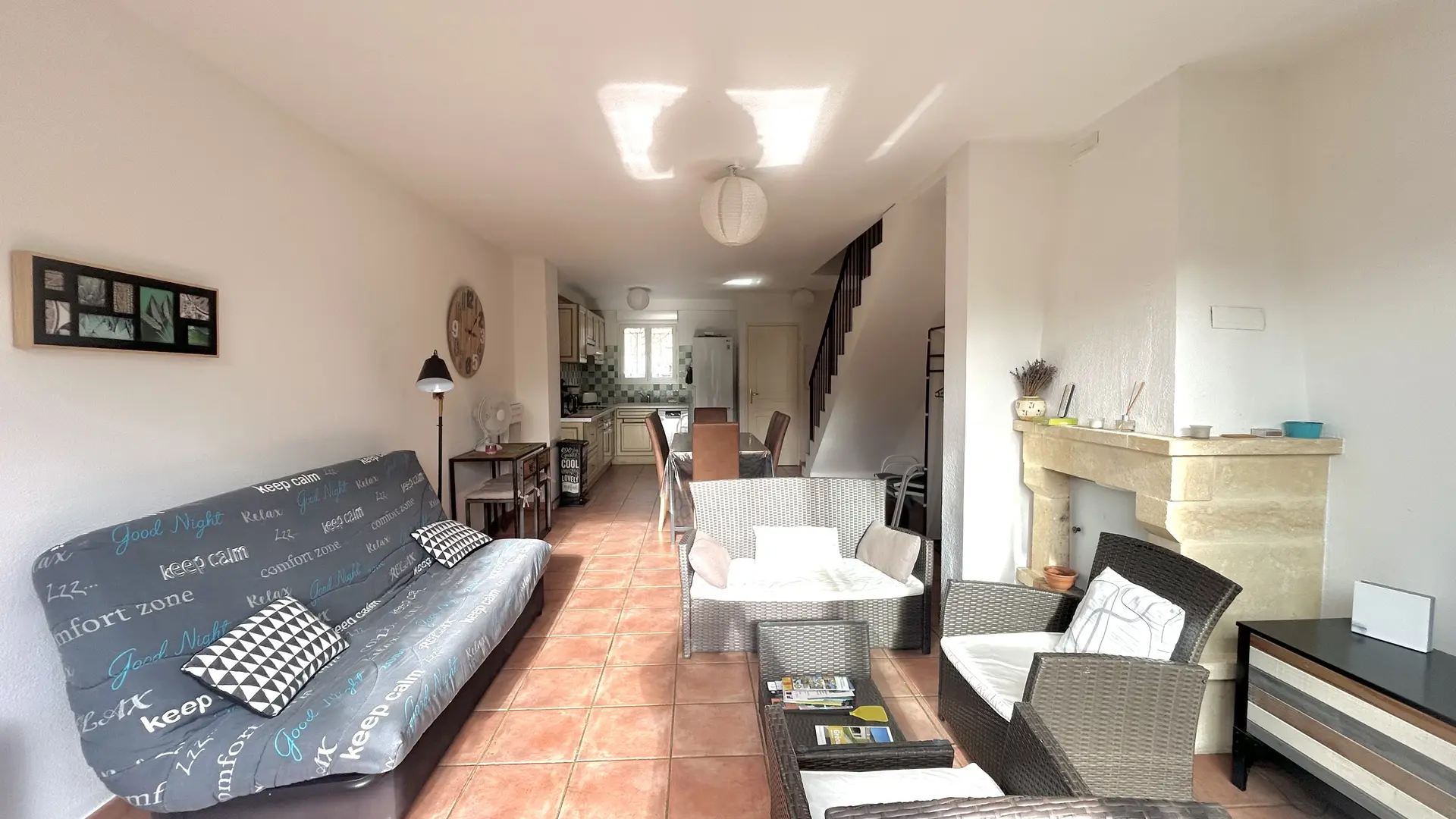 Ground floor: fully-equipped open kitchen with dishwasher, washing machine, microwave, oven, hob, fridge with freezer compartment, WC, living room with TV and wood-burning stove, sofa bed. Terrace, small garden.