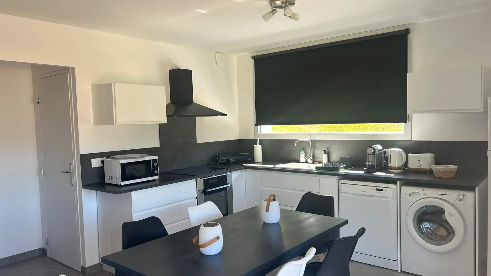 Ground floor: Living/dining room of 25m2 (with sofa bed offering the possibility of an additional bed). Fully-equipped open-plan kitchen (induction hob, pyrolysis oven, microwave, fridge-freezer, dishwasher, washing machine, etc.) with direct access to a terrace and private garden. Separate WC.