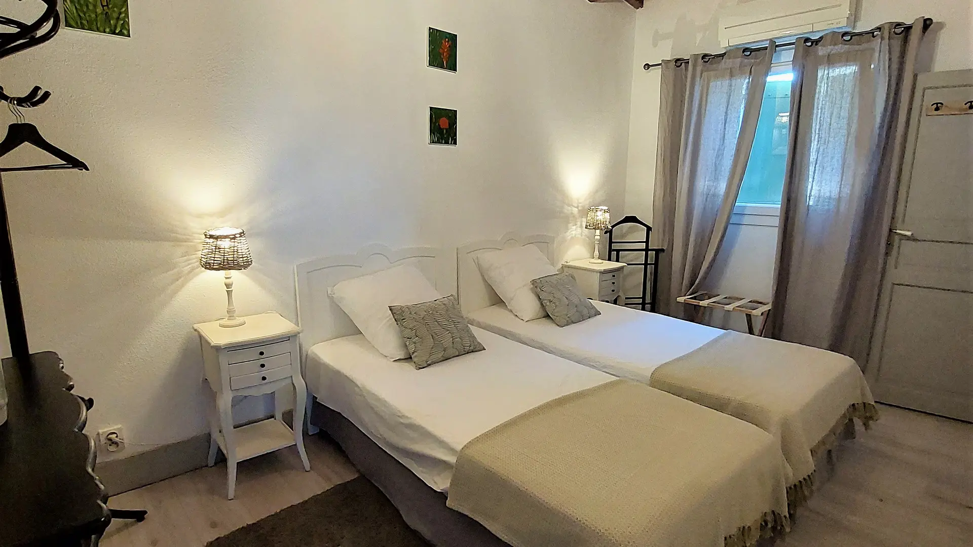 Upstairs are 2 bedrooms with en-suite shower rooms. The first is very bright, with a beautiful view over the vineyards, and features a bathtub, vanity unit, 160x200 bed, desk and large antique wardrobe. The 2nd bedroom has 2 beds 90x190, a chest of drawers and a shower room.