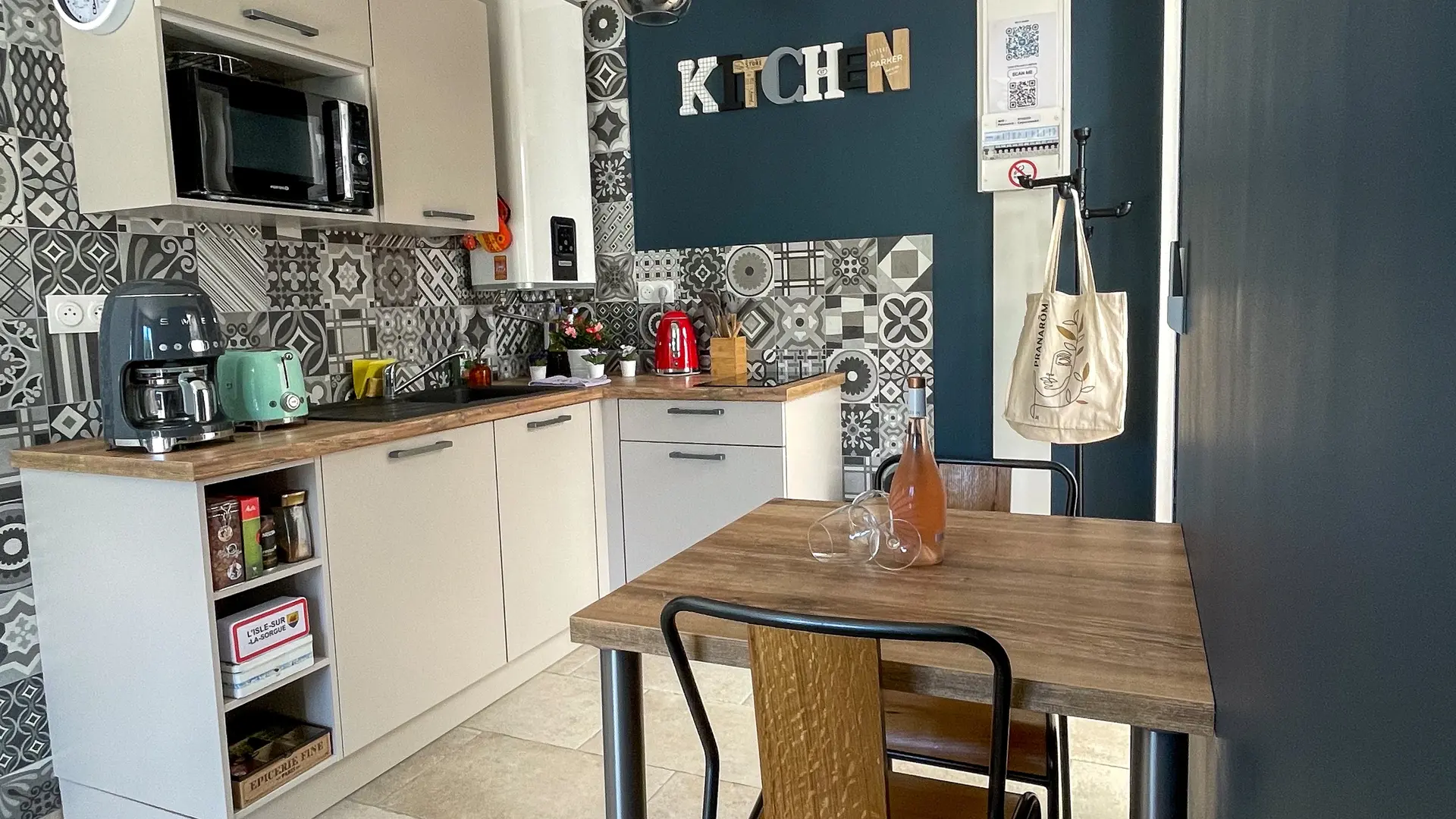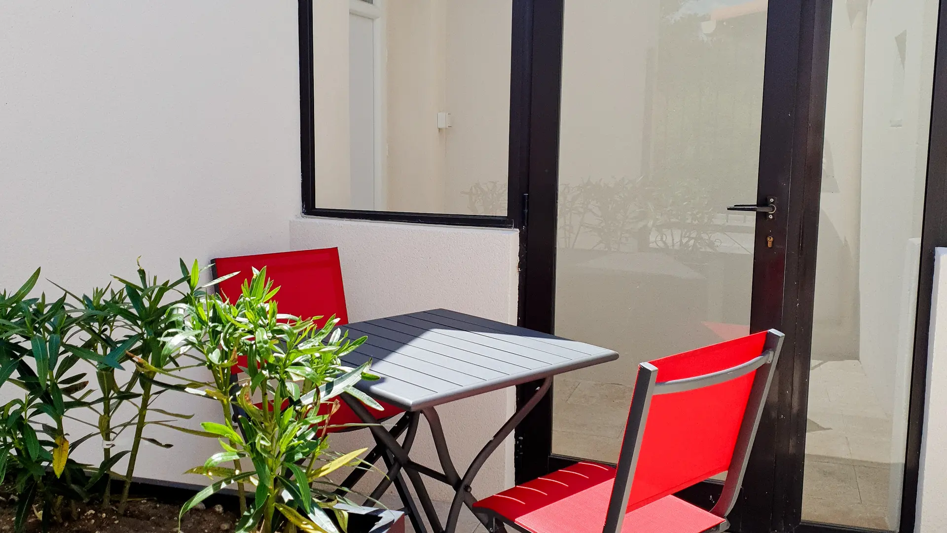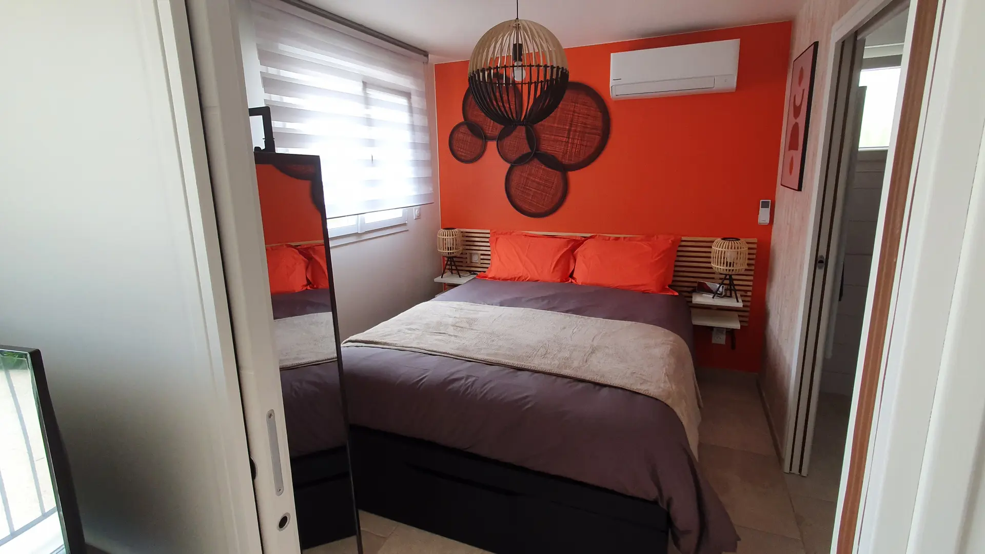 The 25 m² apartment features a fully-equipped kitchen, bedroom with queen-size bed, living room with TV, air conditioning and easy parking nearby.