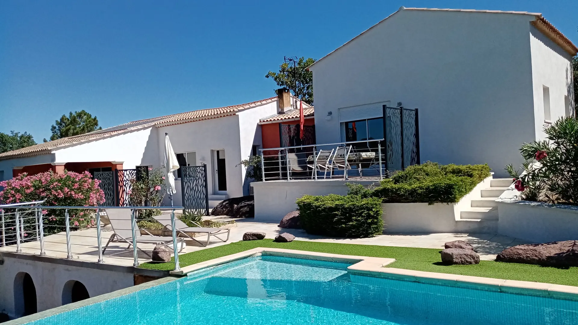 Down the Maures Hills, this 3500 square meter property lies in a quiet environment. It contains 4 holiday rentals without a vis a vis. Both of them offer a refined decor and provide all comfort. You can relax on the terrace or in the 100 square meter garden or even by the shared infinity swimming pool. Ideal place for family with young children.