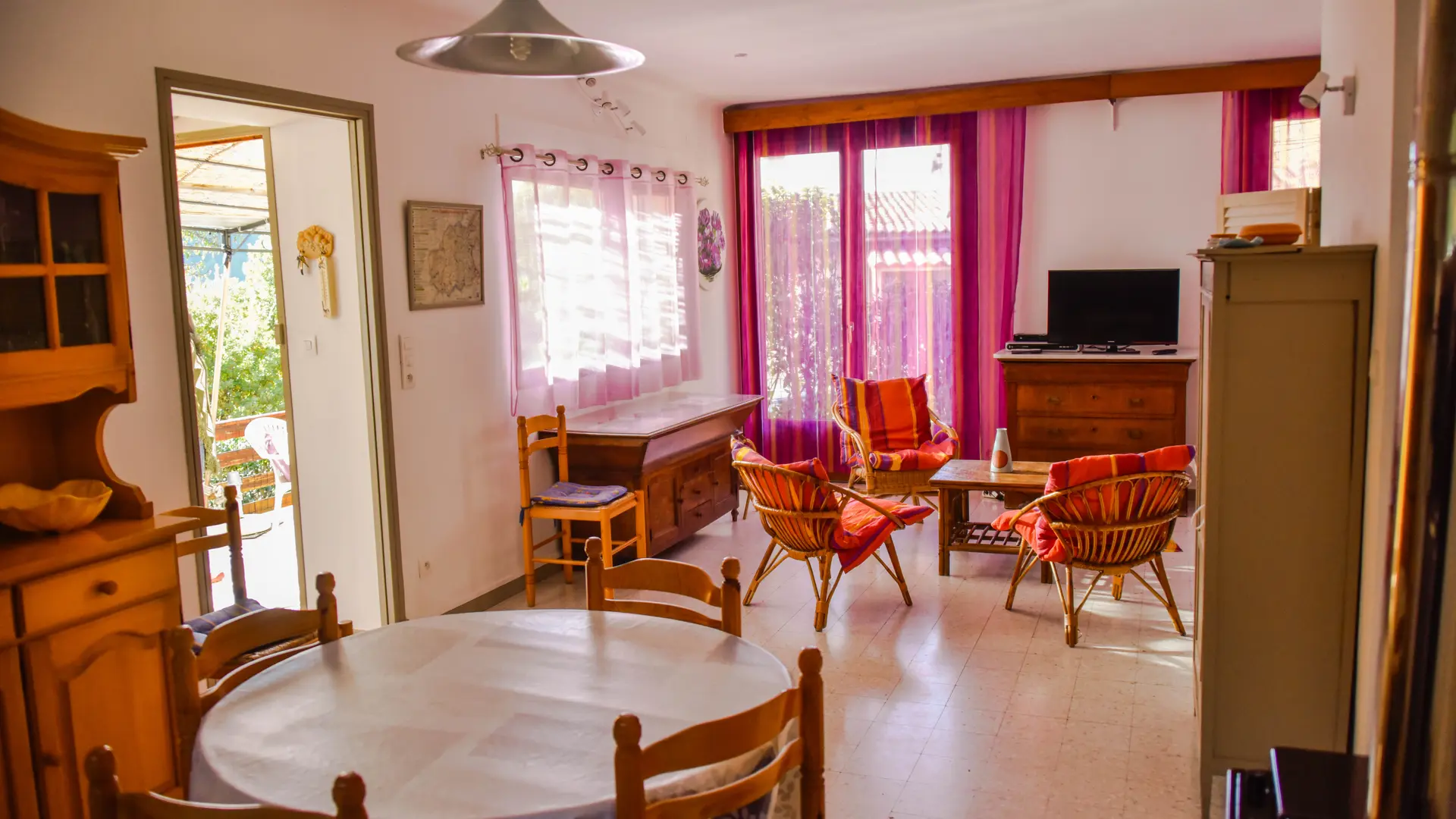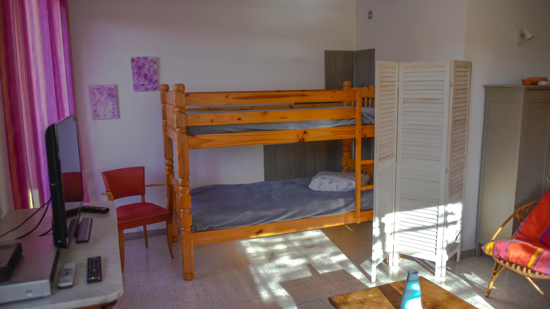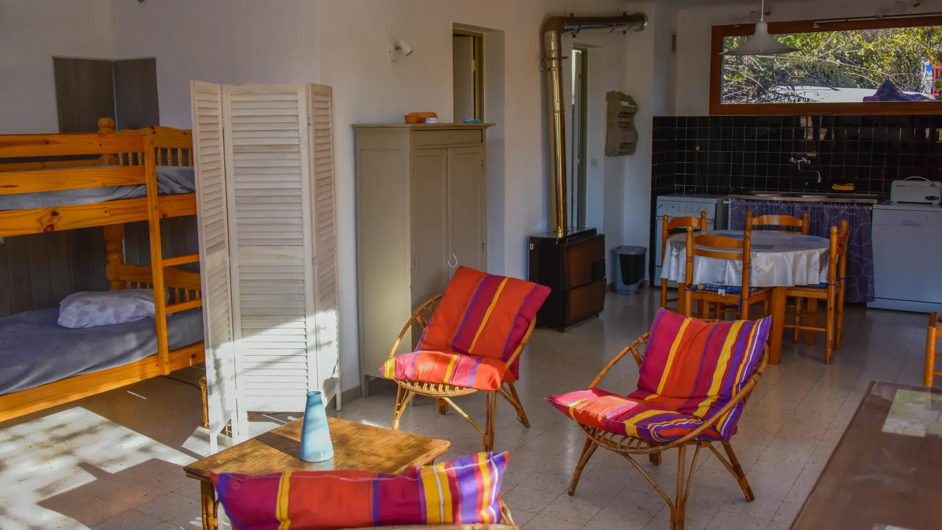 Living room with kitchenette, sitting area and sleeping area with 2 90cm bunk beds, 1 bedroom with 140cm bed, bathroom with shower / wc. Private terrace and garden.
