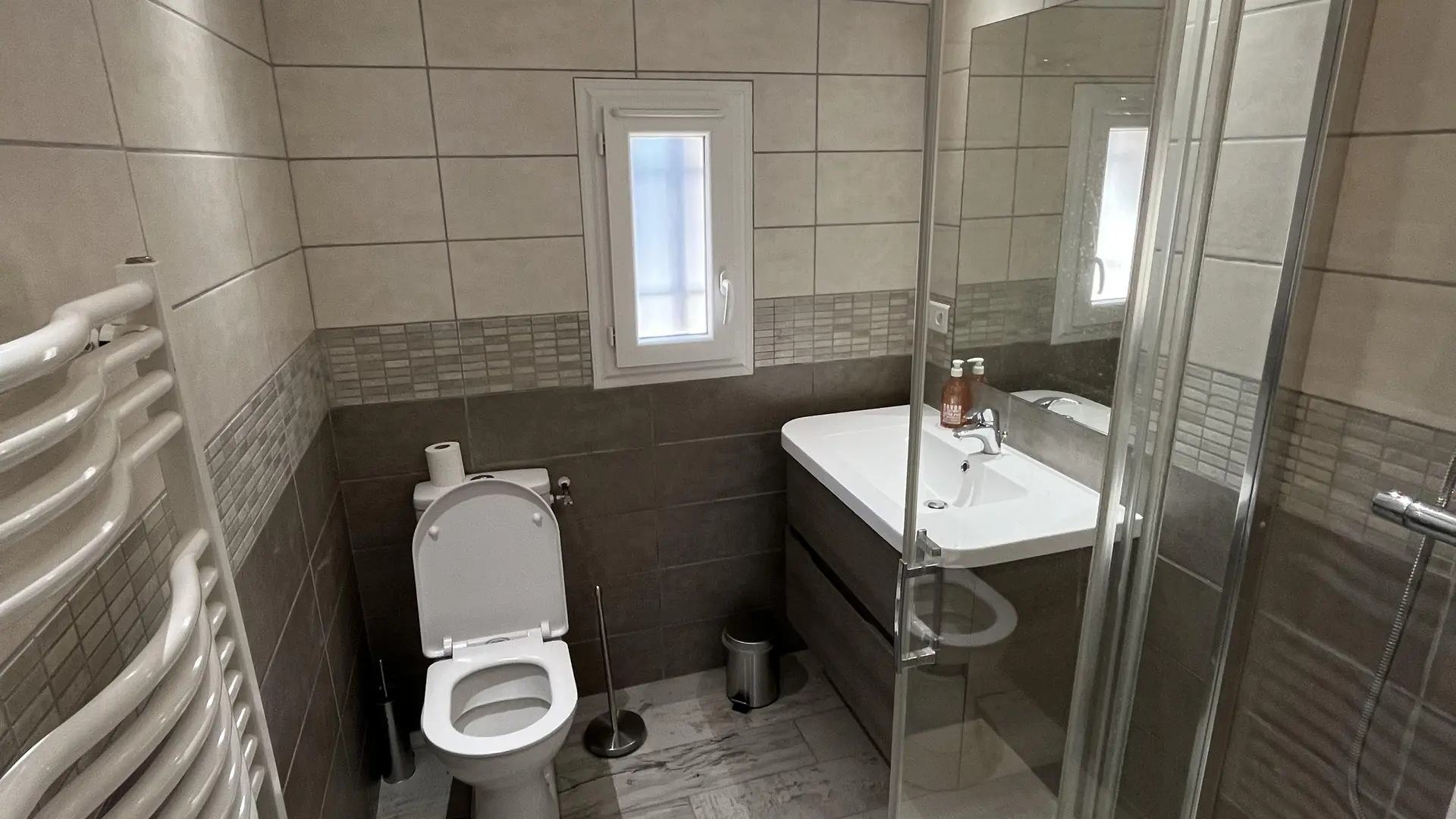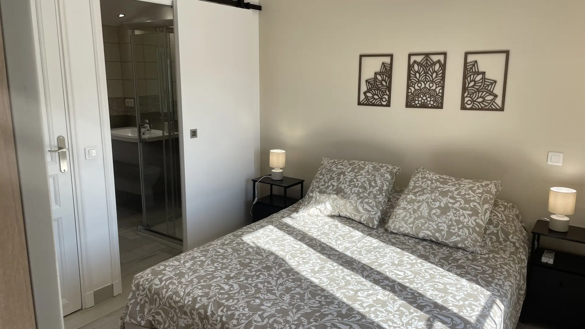 It has a beautiful, bright living space, a new, fully-equipped kitchen, two cosy bedrooms on the ground floor with a separate bathroom and toilet, and one bedroom with an en-suite bathroom upstairs. The large, sunny terrace has views of the surrounding countryside and is equipped with deckchairs, garden furniture, and a plancha grill, perfect for relaxing and unwinding.