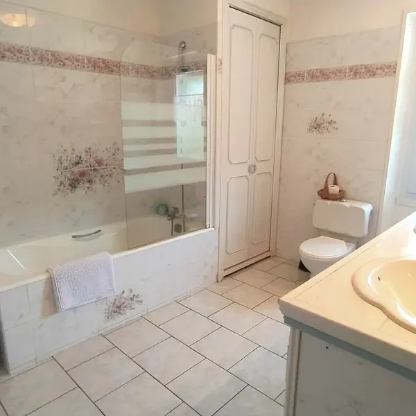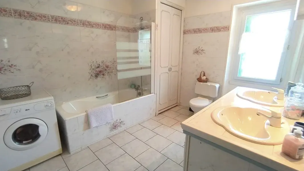 Bathroom with bath, washing machine, 2 basins and WC. Complete equipment for babies on demand. View on the garden. Common 8x4m pool (1,4m deep), accessible from 10h to 19h30, from April 1 to October 1.