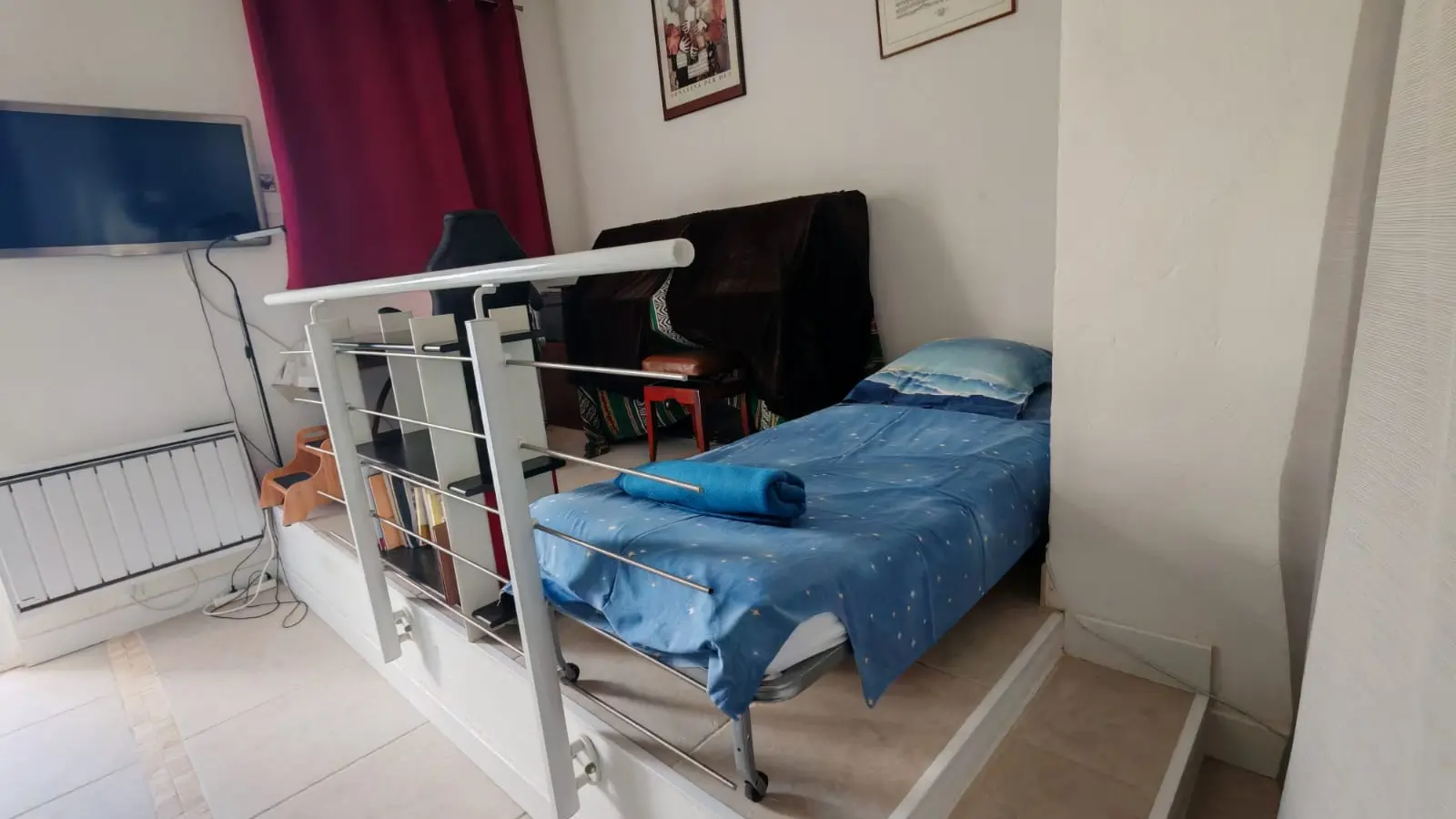 One bedroom is available with a double bed and a TV, and a second bedroom with a desk, a single bed, and a piano (reserved for pianists only!)