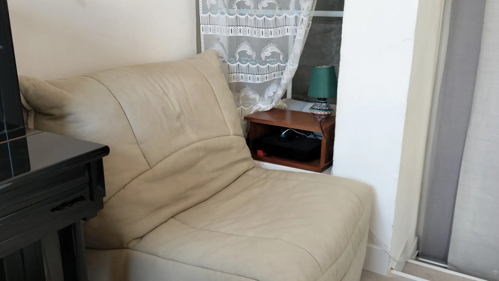The living room is air-conditioned and features a comfortable sofa bed with a 140cm bed.