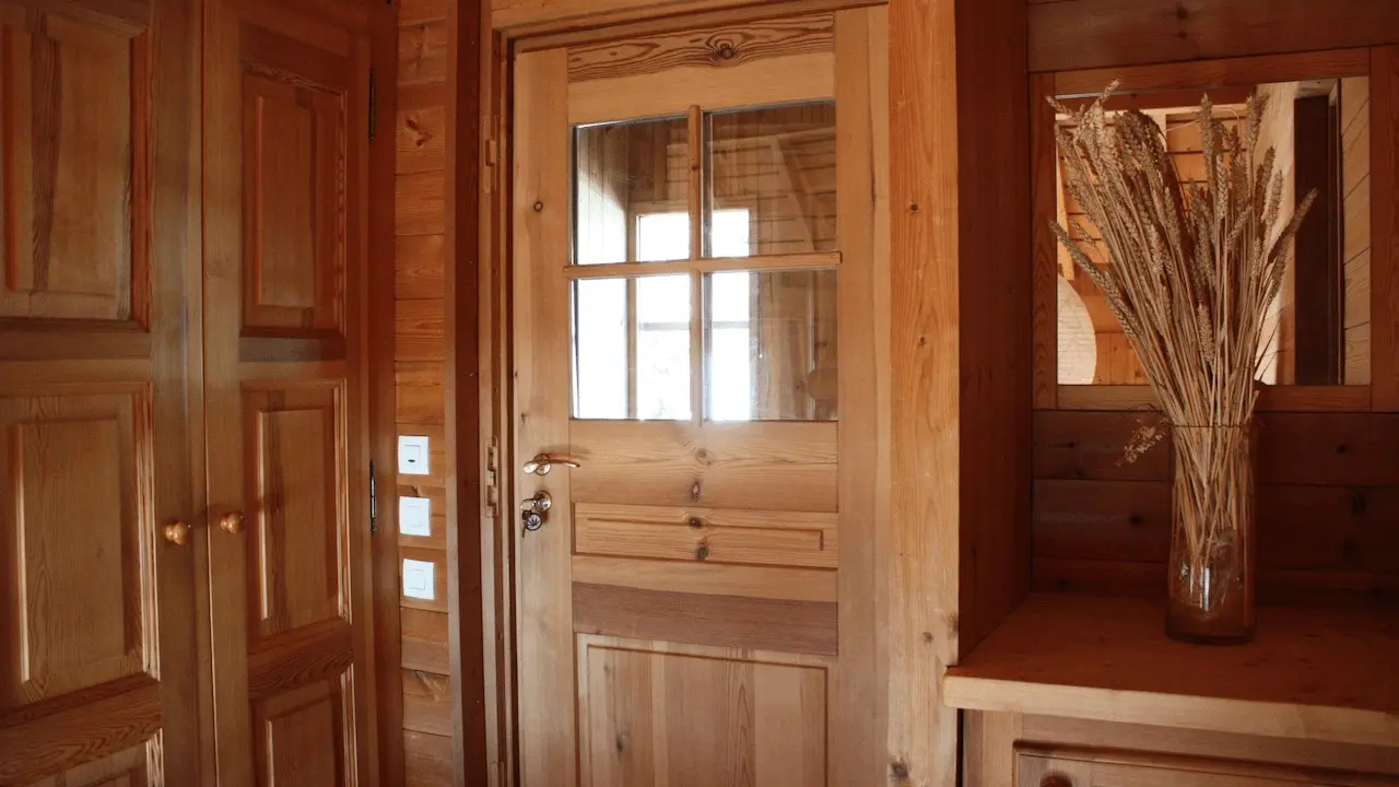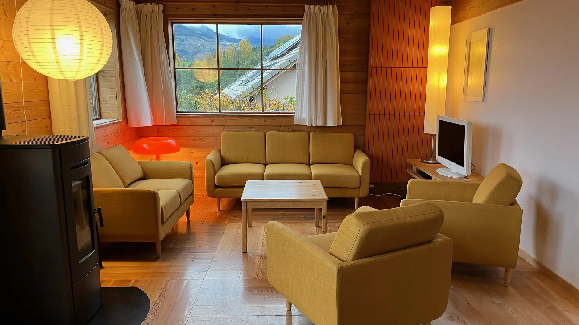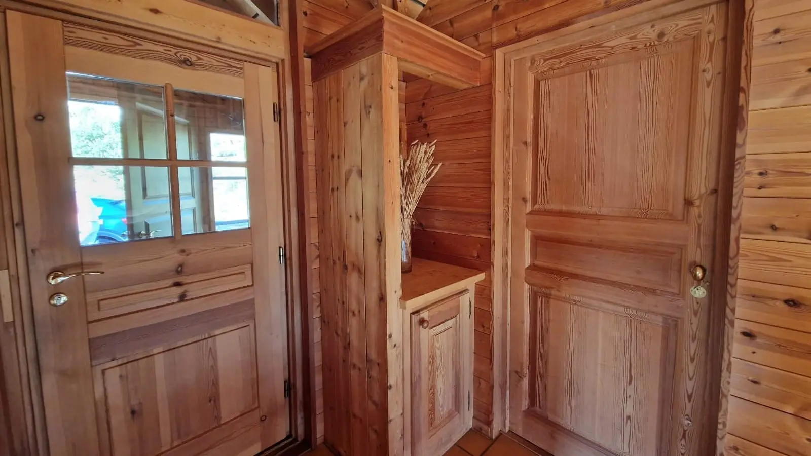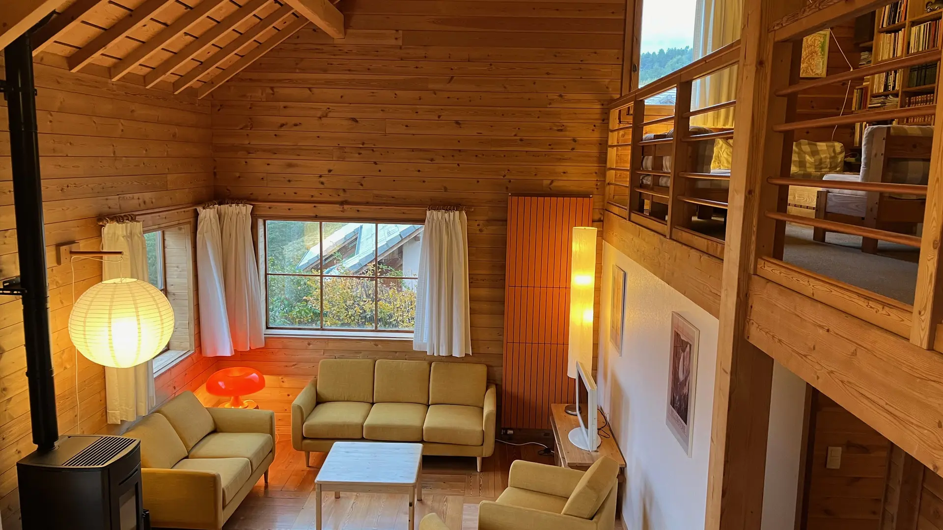 Wood-framed house on a hillside featuring an entrance hatch, a mezzanine with a lounge.