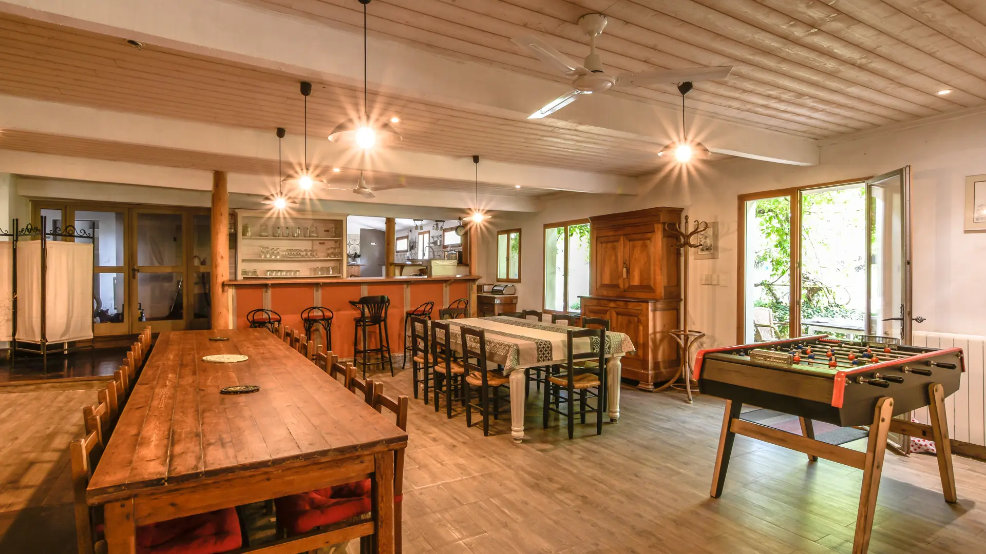 The shared living areas include a spacious 100 m² living room with lounge, dining area, and fireplace, a large adjoining kitchen, and a games room with table football and billiards.