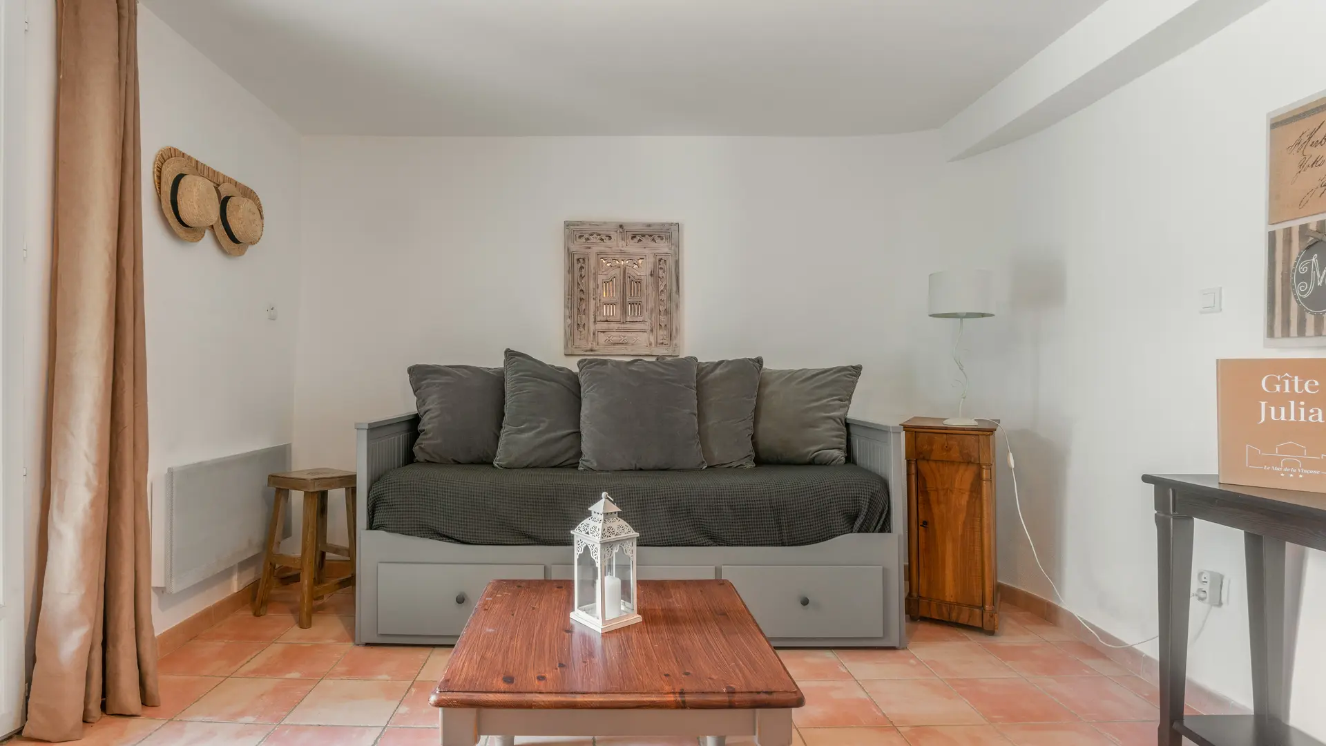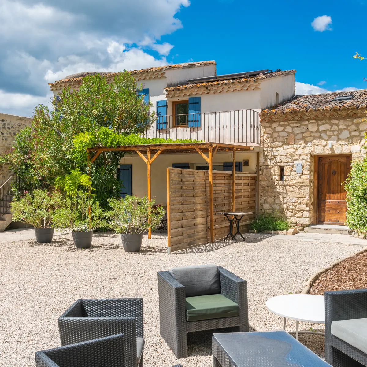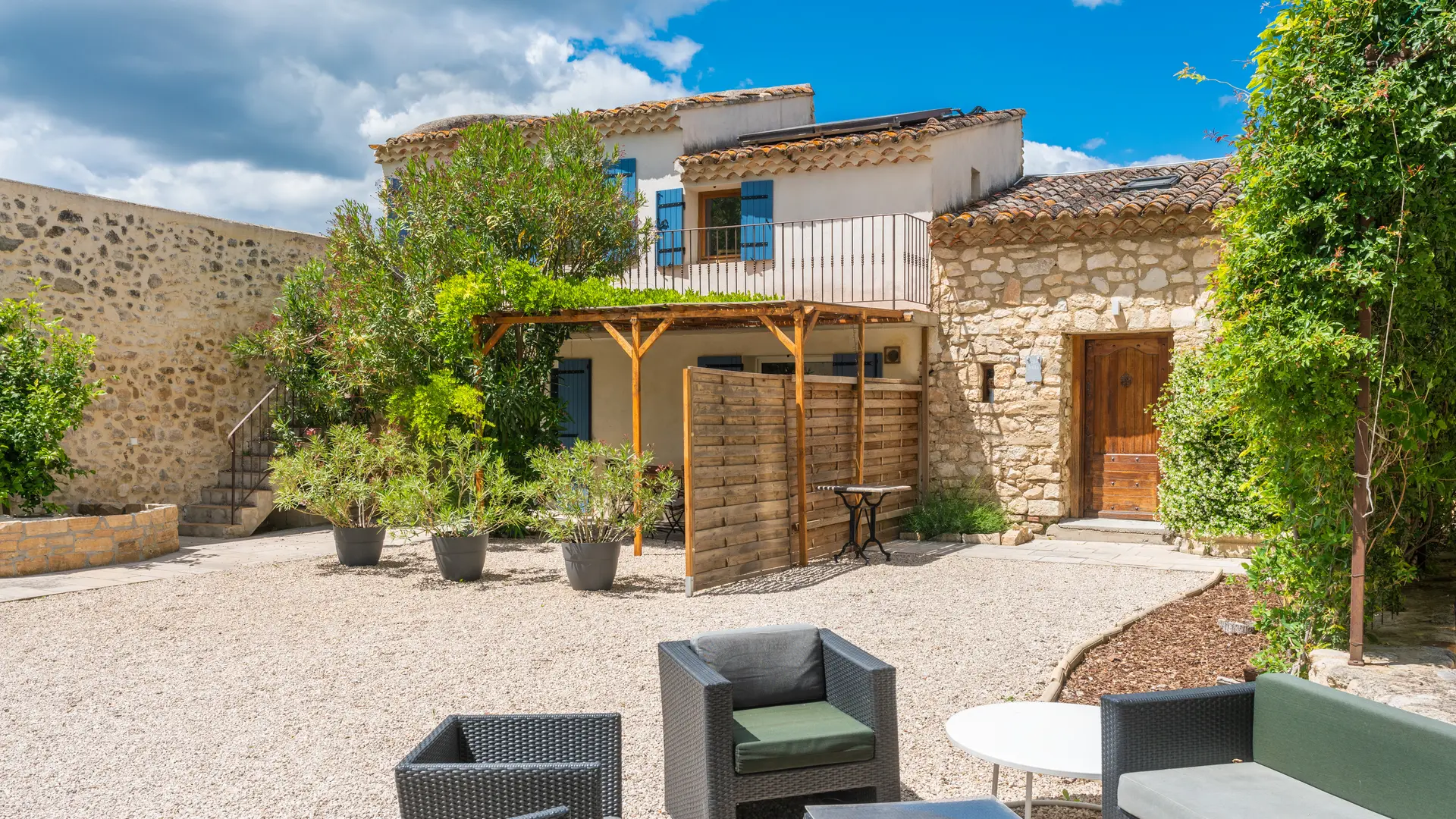 Bright, warm south-facing gîte with large balcony overlooking courtyard and private terrace with garden furniture on ground floor.