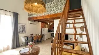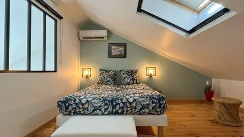 ️ Upstairs bedroom: double bed (140x190), built-in storage and independent air conditioning. High-quality bedding for peaceful nights, plus an additional 140x190 sofa-bed in the living room with premium mattress.