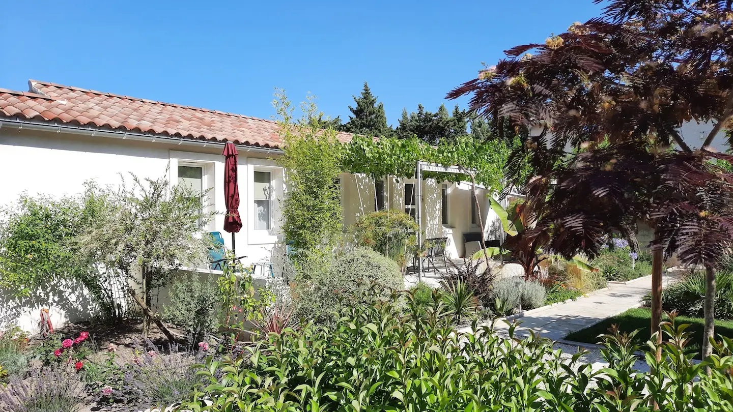 Located just 6km from Avignon TGV station, the Relais d'Eden is an ideal base between the City of the Popes and the Alpilles. This house from the beginning of the XXth century was completely renovated in 2020. Located near the owners' house but completely independent, it has its own terrace and garden, with floral arrangements (small rose garden). Private parking on the property. The gite is composed of a living room with sitting area (sofa, 2 armchairs, flat screen TV connected with satellite channels, speaker connected by bluetooth), dining area with a high table and 4 high chairs, open fitted kitchen with fridge / freezer, 4 burner induction hob, extractor hood, oven / microwave combination, dishwasher. Washing machine. 2 bedrooms, each with 2 80x200cm beds that can be combined into 1 160x200cm bed and desk. Private bathroom for each bedroom with skylight, walk-in shower, basin and WC. 55m² private terrace with trellis, comfortable garden furniture, barbecue. Petanque. Private garden approximately 400 m². Reversible air conditioning (included). Sheets and towels provided. End of stay cleaning on request. Pets allowed under certain conditions: 1 small pet allowed. High chair and cot provided on request. Wifi.