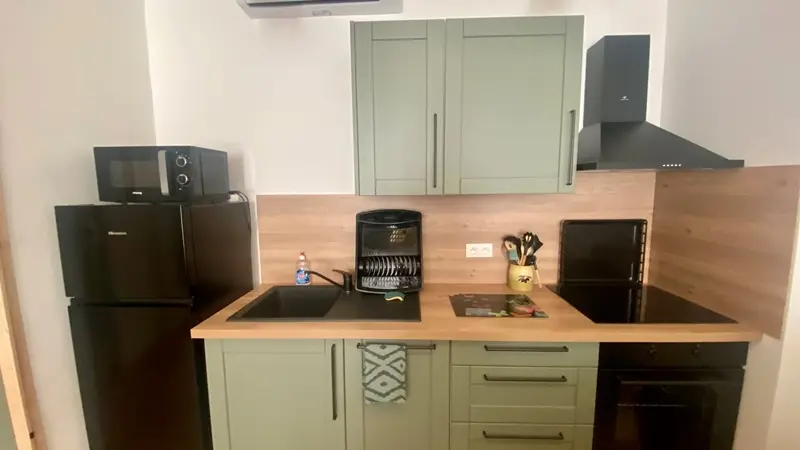 Open-plan kitchen equipped with fridge-freezer, oven, microwave, ceramic hob, extractor hood, toaster.