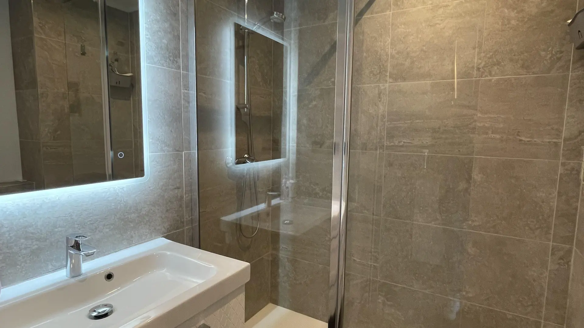 - bathroom with walk-in shower, toilet and washing machine