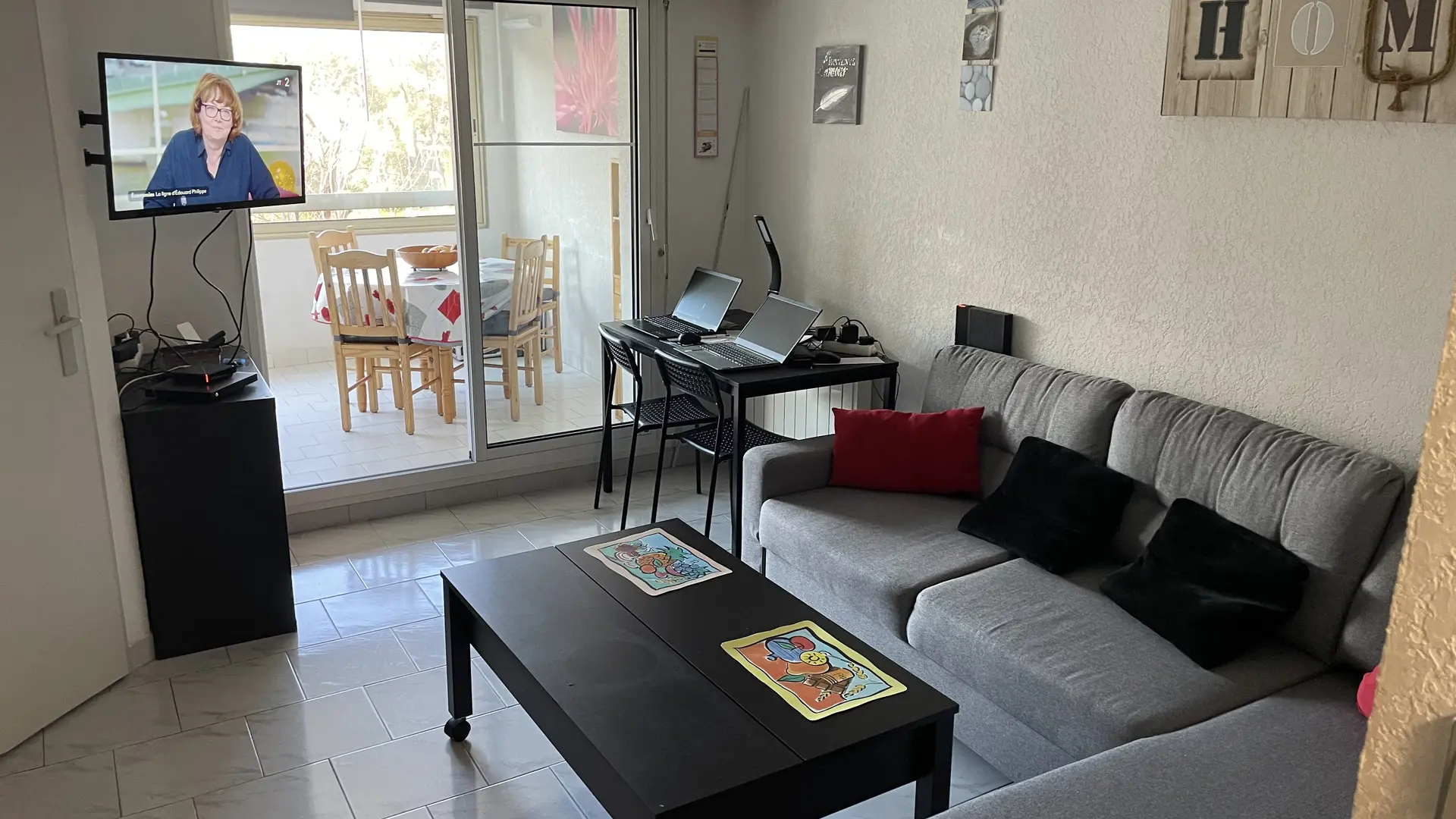 Air-conditioned apartment on 1st floor with elevator, 400 m from the beach in a secure estate with Olympic-size swimming pool and restaurant, spa area, tennis courts, pétanque, children's playground and lakes. All shops and entertainment without taking the car