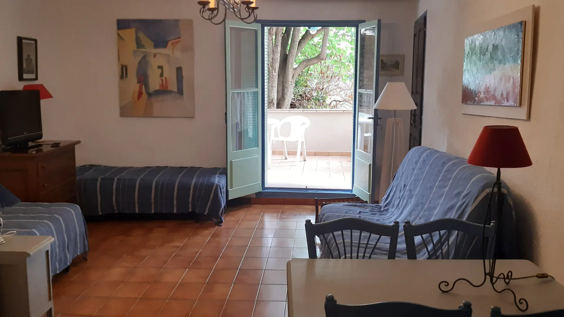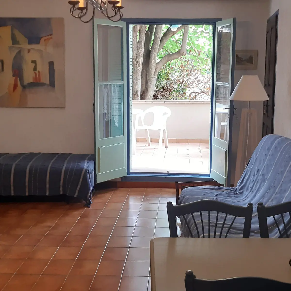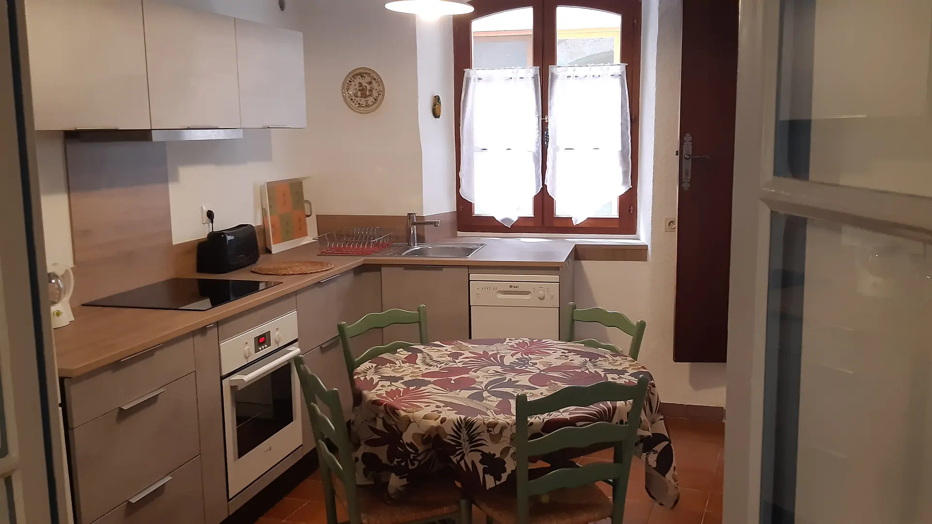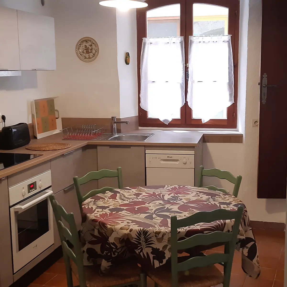 45 m², separate Küche, 30 m² großes Wohnzimmer mit Schlafmöglichkeit und Zugang zur Terrasse. Erdgeschoss eines Dorfhauses, ruhige Straße, Schlafsofa (140 cm), 2 Betten (90 cm), Haushaltswäsche auf Anfrage.