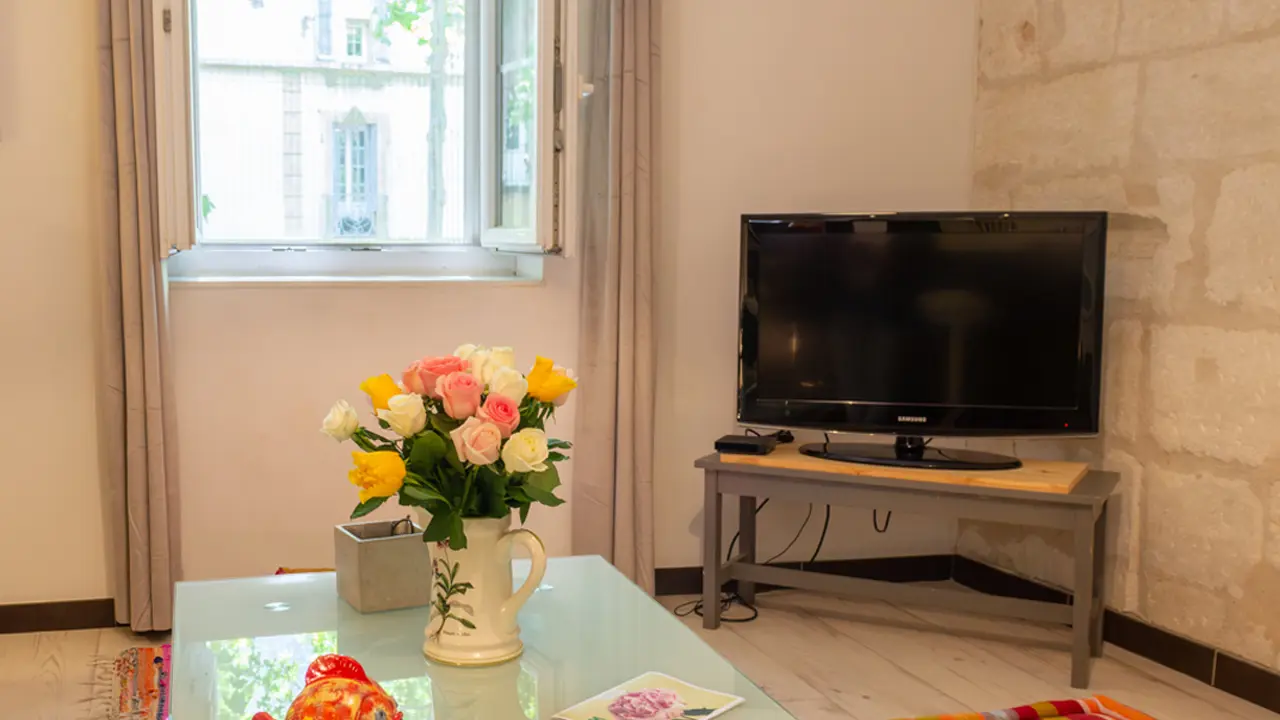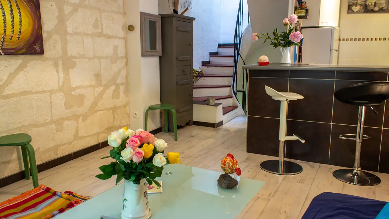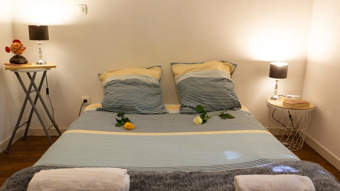 This duplex is both sunny and protected by our beautiful plane trees in the summer. It includes 2 bedrooms, an American kitchen, a bathroom and a living room. On the 1st floor :- The American kitchen overlooking the living room is equipped with a washing machine, Senseo coffee maker, kettle, induction hob, microwave, oven, large refrigerator, equipped with utensils and kitchen knives.- The living room is equipped with a double sofa bed, 1 TV and portable network covered by the orange fiber Wifi. The living room is equipped with a double sofa bed, a TV and a portable network covered by orange fiber Wifi, 2 poufs, 1 table convertible into a dining table with its handle on the side to go up or down according to your desires of the moment.On the first floor a terrace space on the paths with 1 table and chairs.On the 2nd floor:- 2 bedrooms, a shower cabin equipped with a sink and a toilet as well as a closet located in the corridor serving the bedrooms.- In the first bedroom, a double bed and a single bed. In the first room, a bed of 140 with arrangements and closet - In the second room, 1 bed in 90 To be as close as possible to your relaxation, your beds will be made at your arrival and you will just have to slip into them as in the hotel.