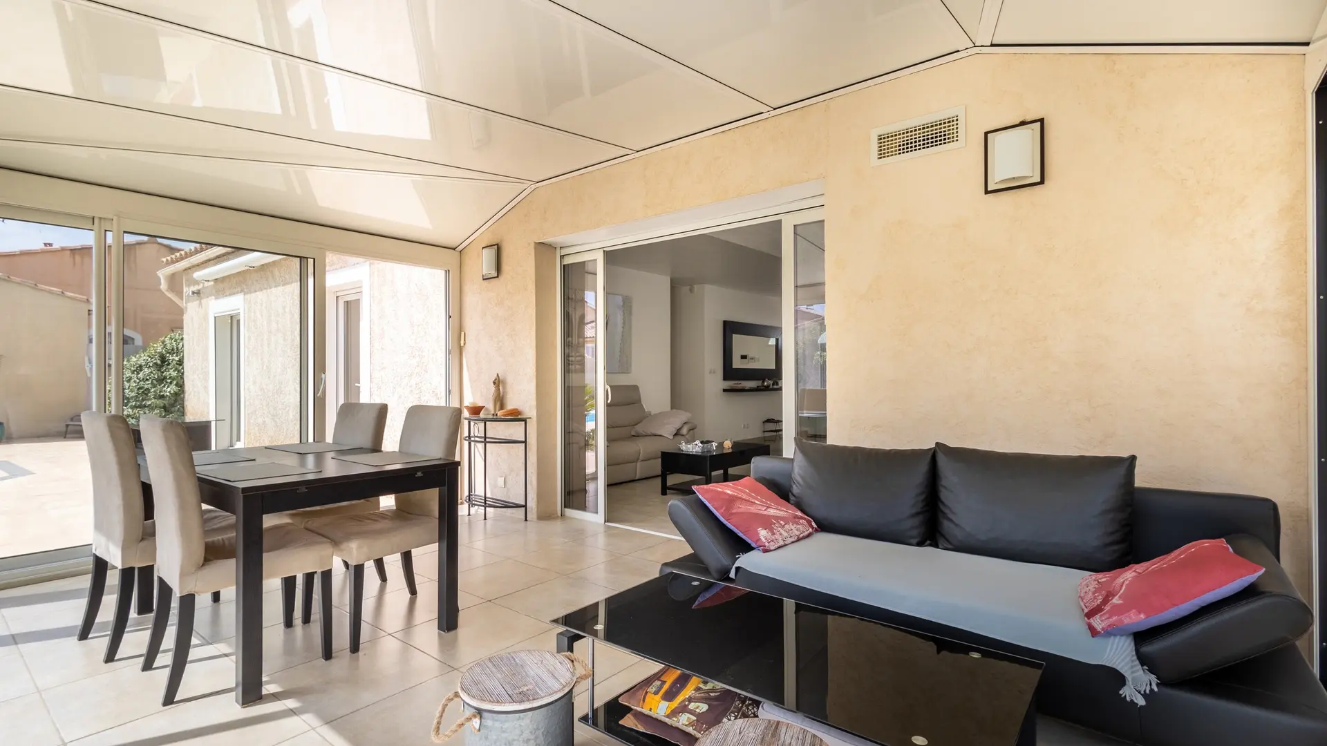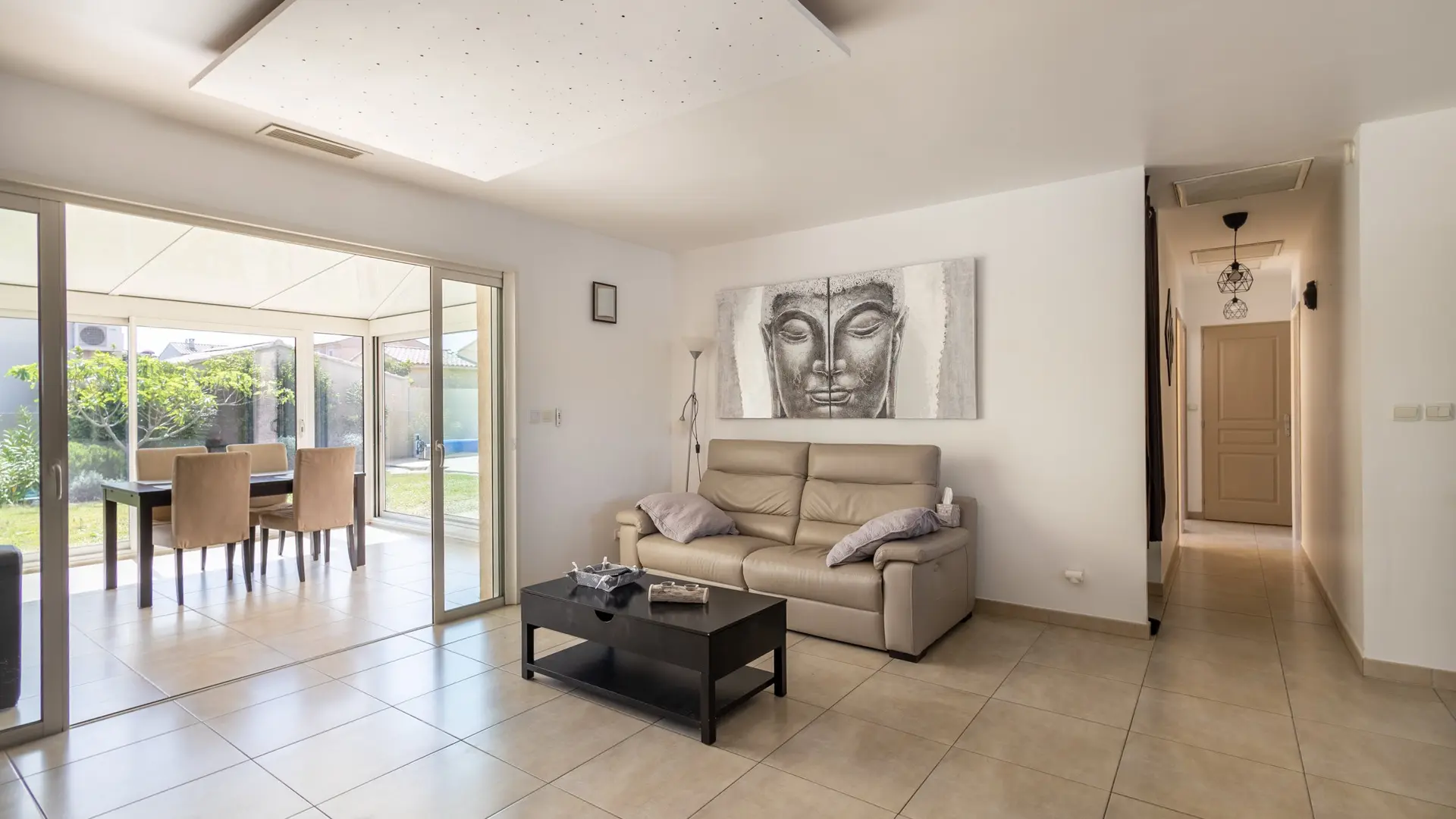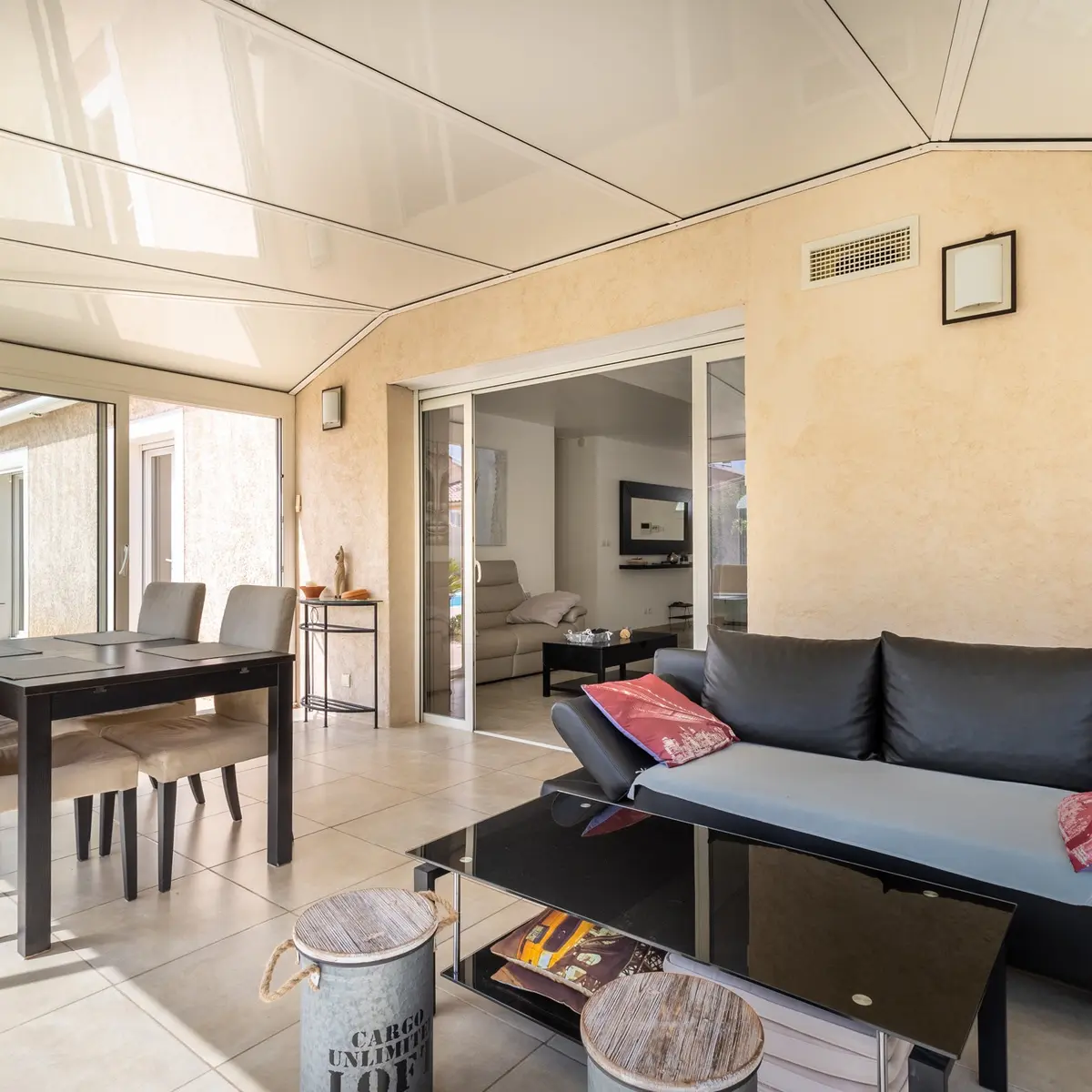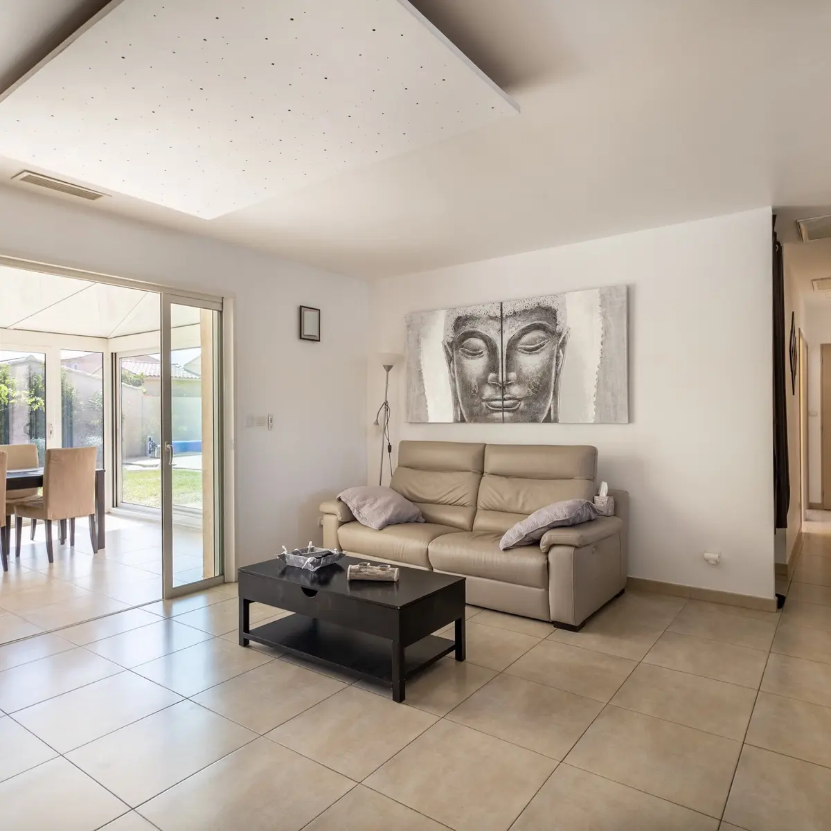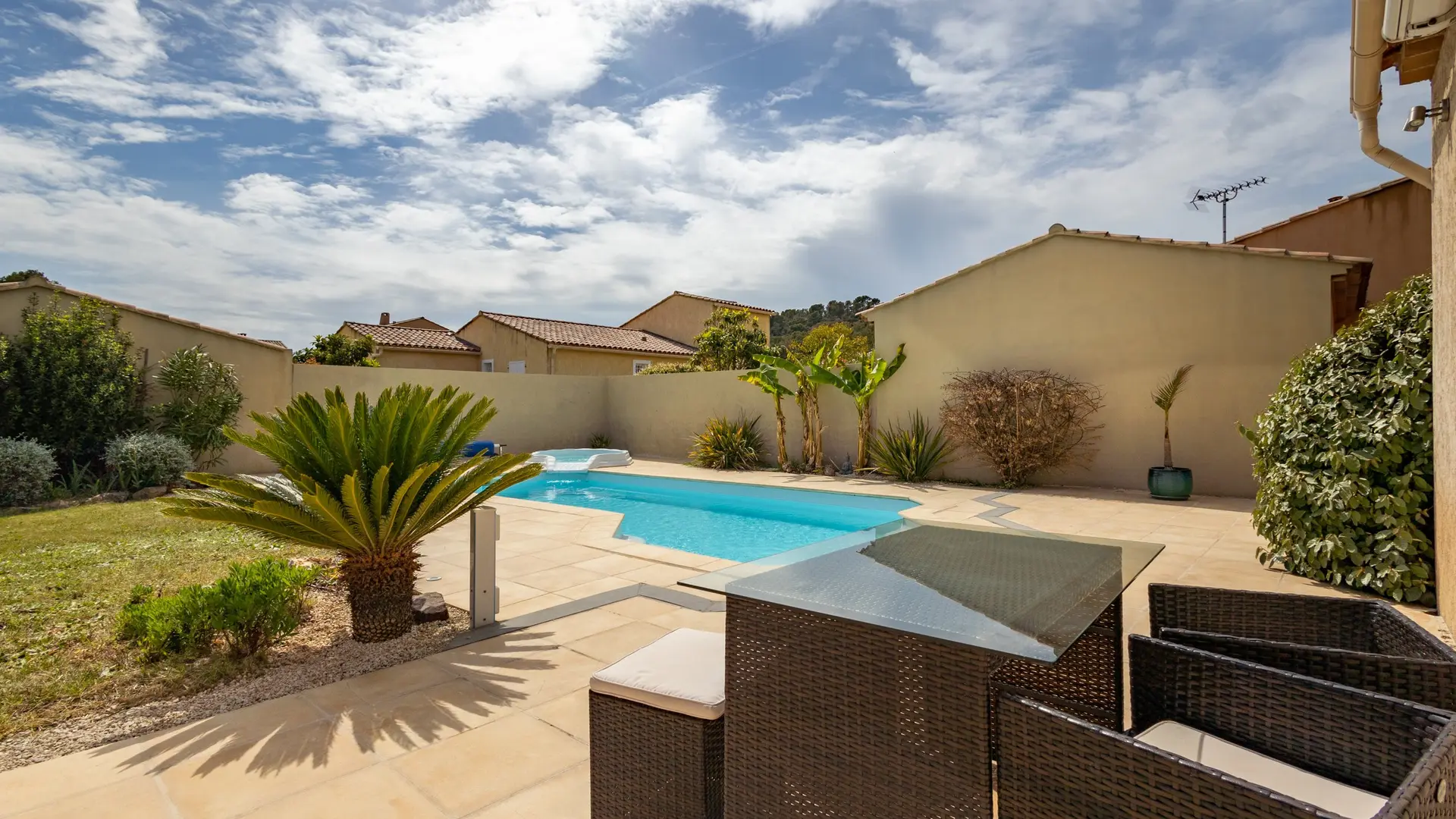 Luxury, recent (10 years), south-facing villa in residential area, quiet, fenced, not overlooked, single-storey, 110 m2, with landscaped 600 m2 garden. In-ground 8x4m swimming pool with small pool and deckchairs. Adjoining parking spaces for several vehicles. Full access to the villa, except for the garage. Land not occupied by the owner.