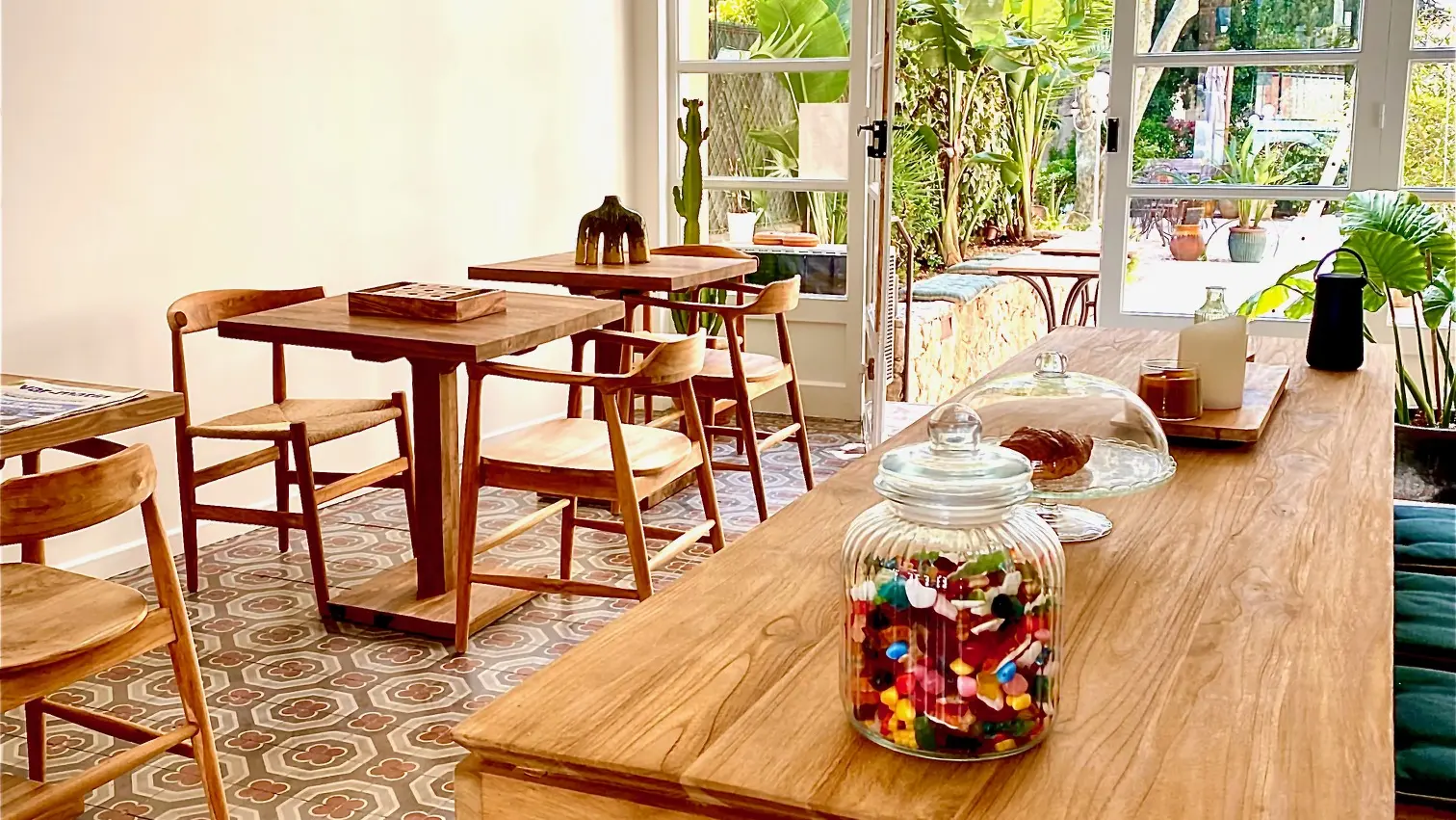 Breakfasts and meals in summer time in the shade of hundred-year-old plane trees and palm trees in a flowered garden with Mediterranean colours and scents.