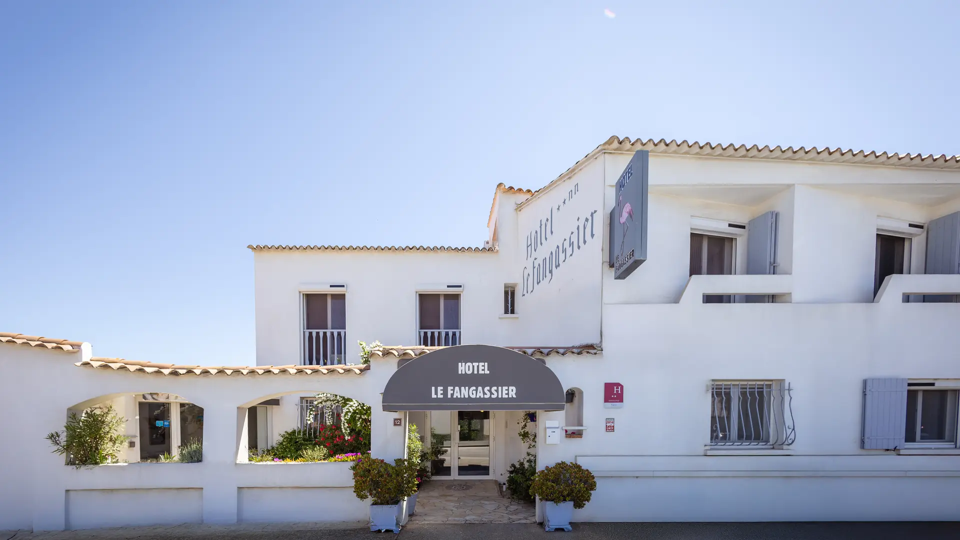 Entering from the Route de Cacharel, in a quiet neighborhood, the hotel is housed in a typical Camargue building with whitewashed walls and blue shutters.
