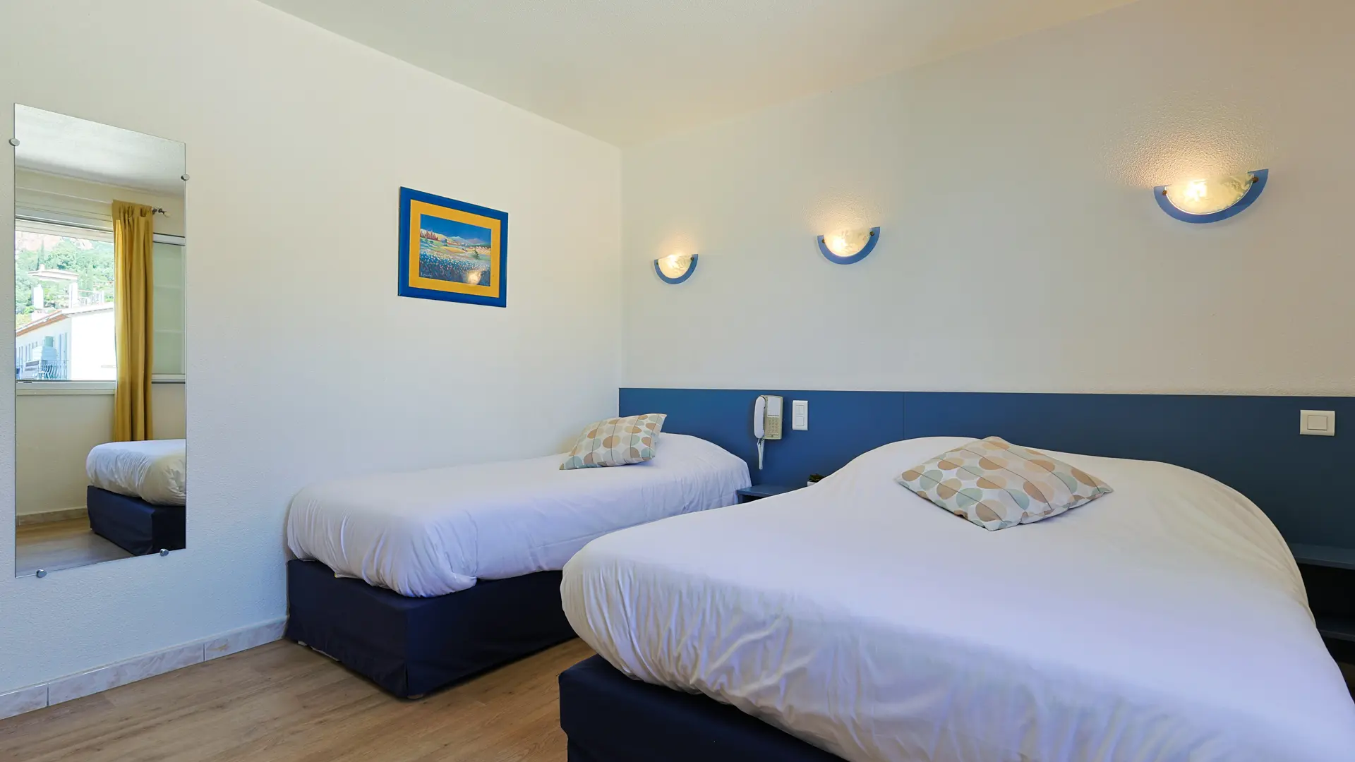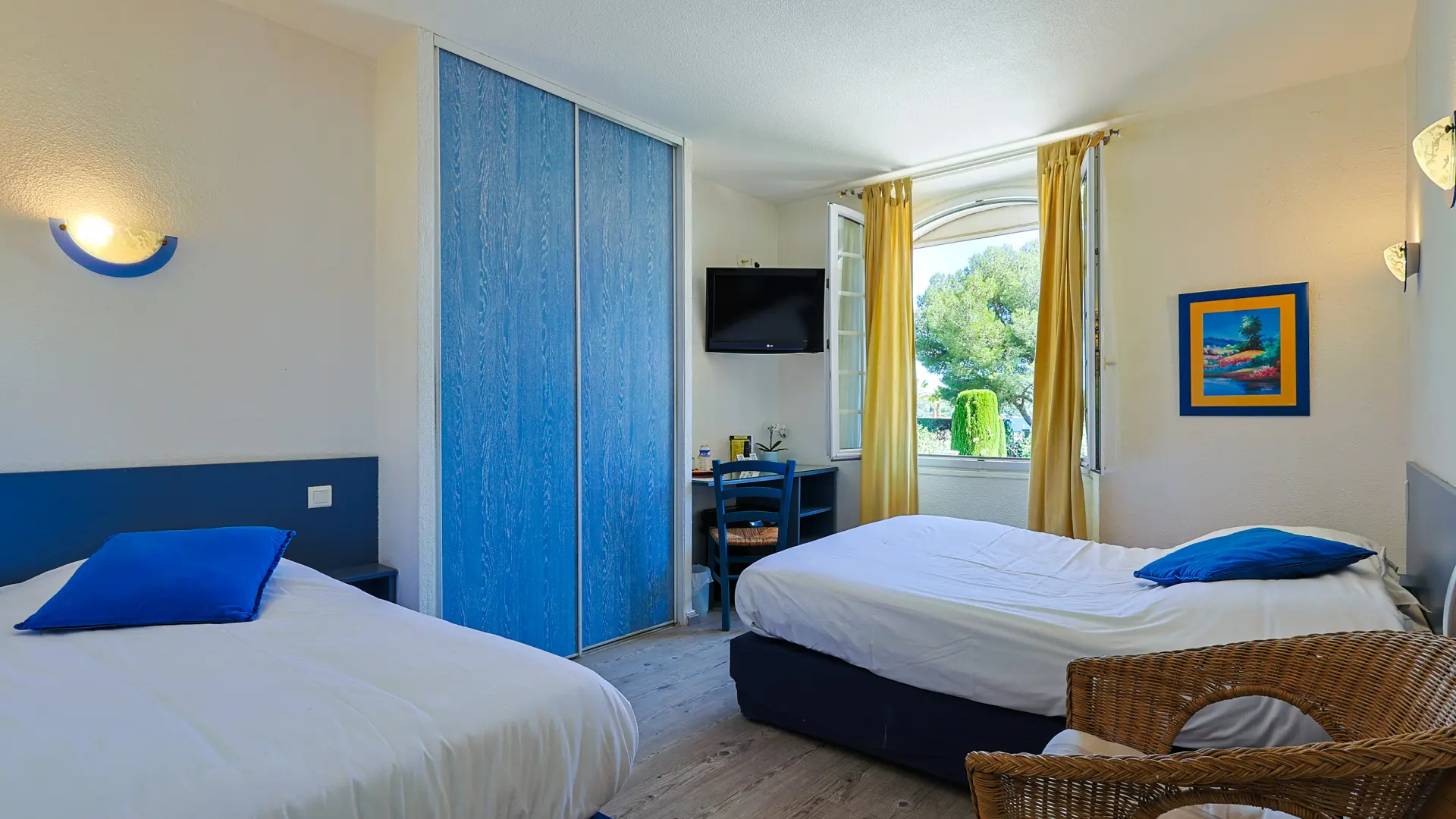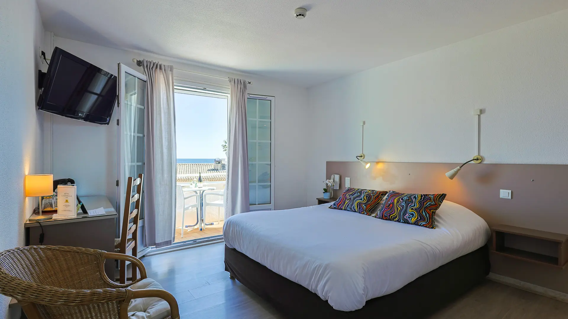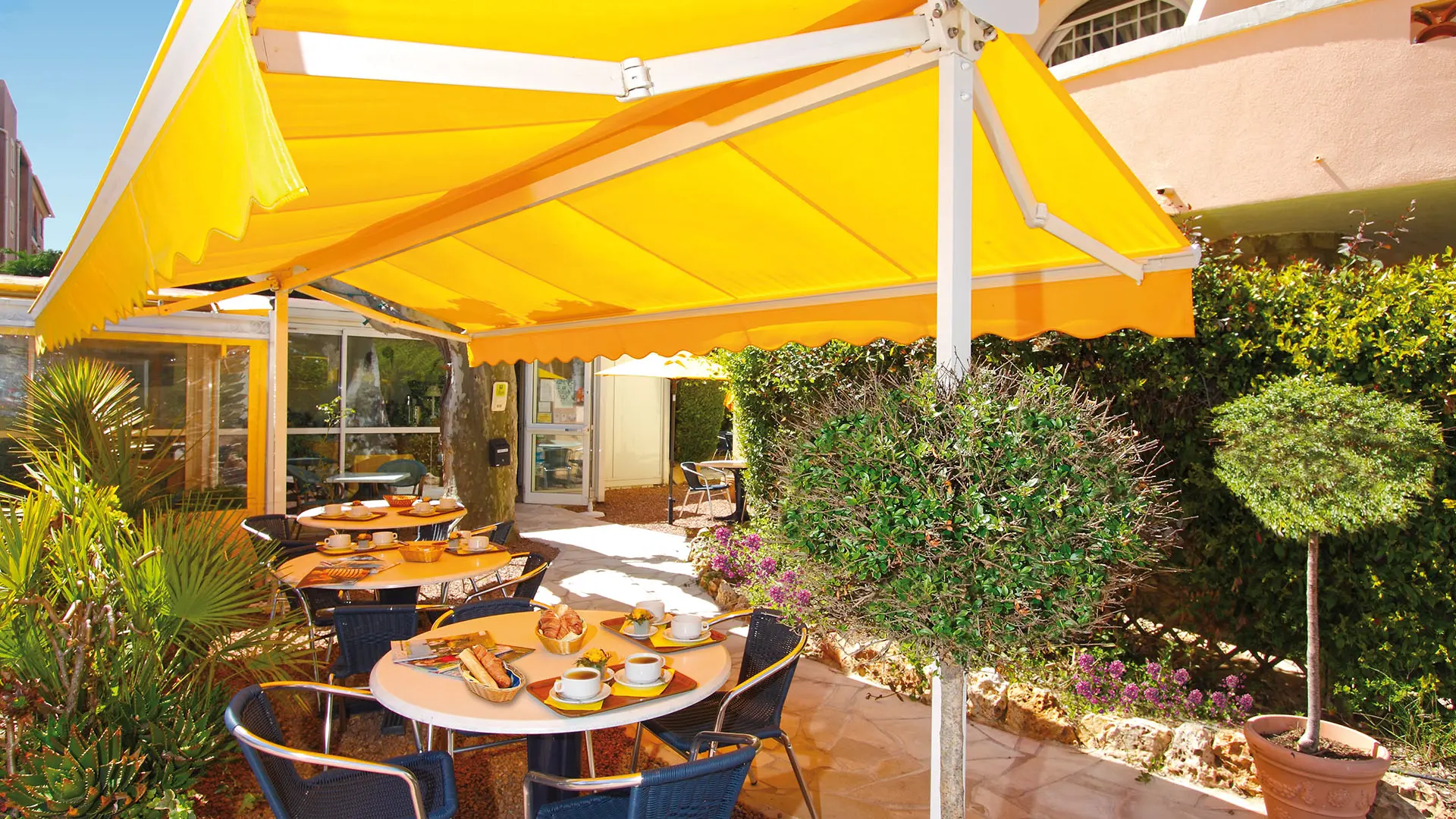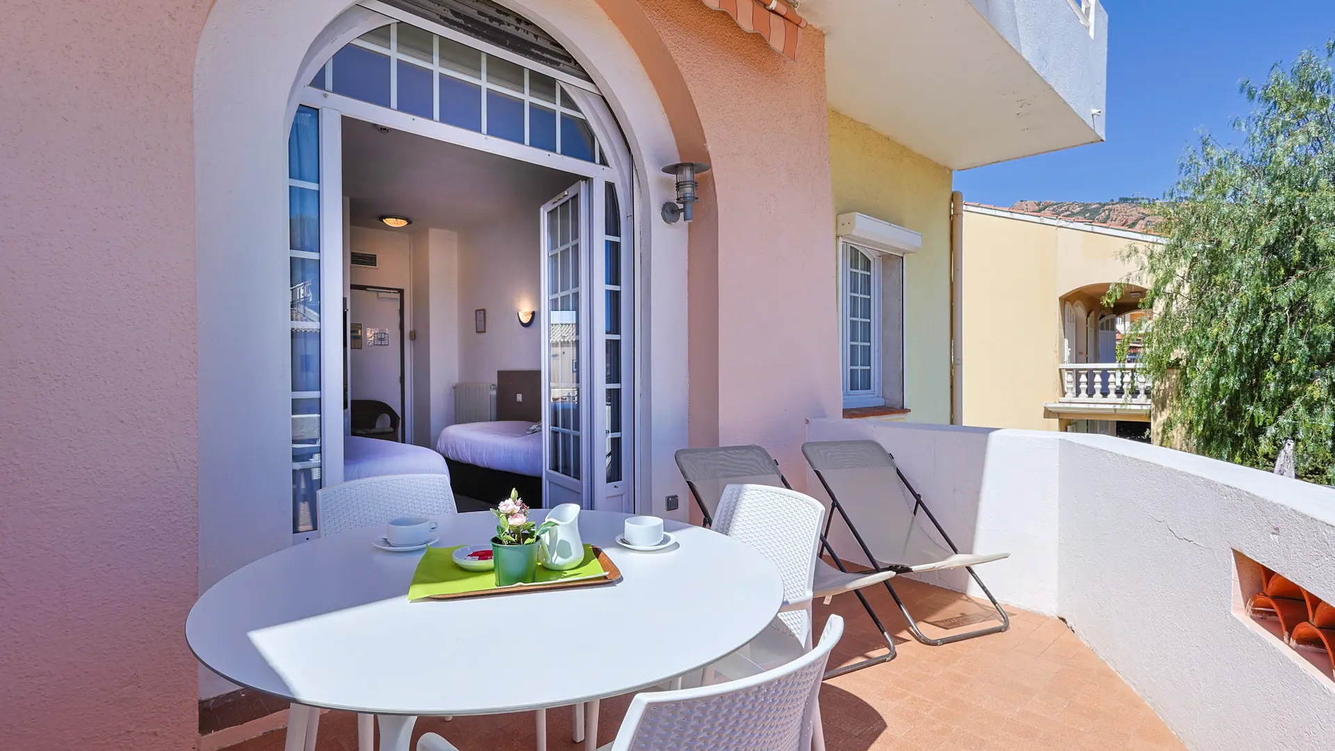 The hotel was completely renovated and now features comfortable air-conditioned rooms. The south-facing room overlooking the Esterel and the bay of Agay come with a balcony. Our seaview rooms upstairs or on the ground floor feature private terraces and include a balcony, shower or bathroom, toilets, telephone, satellite TV. Also available are two adjoining family rooms with private terrace, shower, toilets, telephone, satellite TV and fridge accommodating 4-6 guests. Our hotel comes with a closed car park and is located near shops and restaurants. Our buffet style breakfast is served in our sunny garden or inside. Our guests can picnic for lunch or dinner in our garden under cooling plane trees. The hotel is ideally located 10 m from the public sandy beach or 40 m from the private beach of Agay where beach beds and umbrellas can be rented. Water sports options nearby include parasailing, small boats and windsurfing equipment rentals and a scuba diving school. From the port of Agay, boat rides and excursions to Saint-Raphaël, Saint-Tropez and the Iles du Lerins are available. Hiking, mountain biking, horseback riding in the Esterel and pony rides for children (3 km) and an 18 hole golf course (8 km) are also availalble.