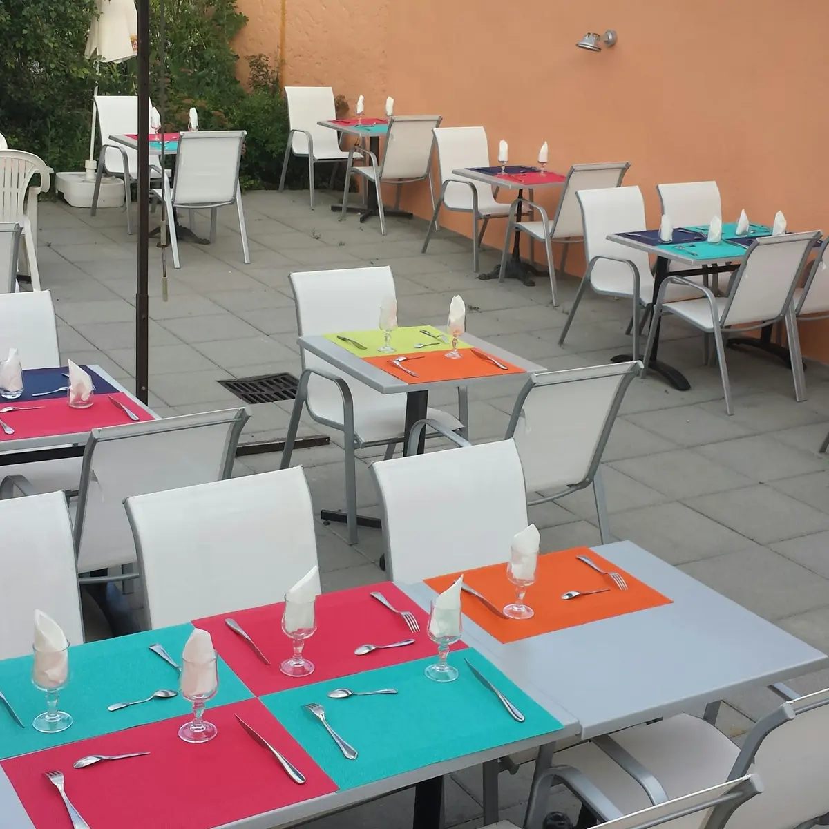 The hotel has a restaurant with warm and cosy colours as well as a garden terrace facing Mont Colombis.