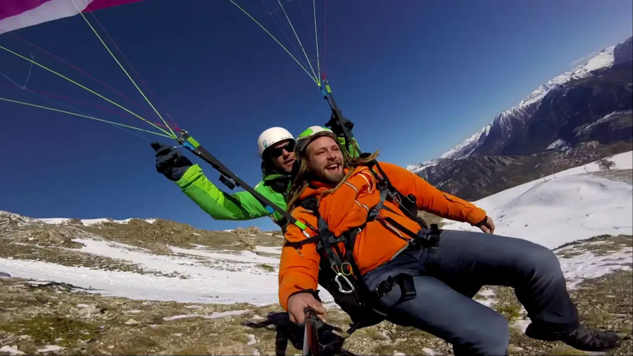 Once these steps have been completed, it's time for action: in just a few steps, you will take off. All you have to do is sit back, admire the landscape, watch the birds and other paragliders from above. The flight will include a few turns and speed variations to give you a taste of the sensations and manoeuvrability of a tandem paraglider. If you wish, you can even take the controls.