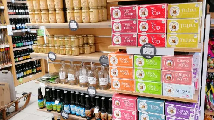 A wide range of products is offered: pastries and artisanal breads, regional products, organic products, butcher's shop, delicatessen and local cheeses, take-away meals, wine cellar, beer cellar, cold drinks.