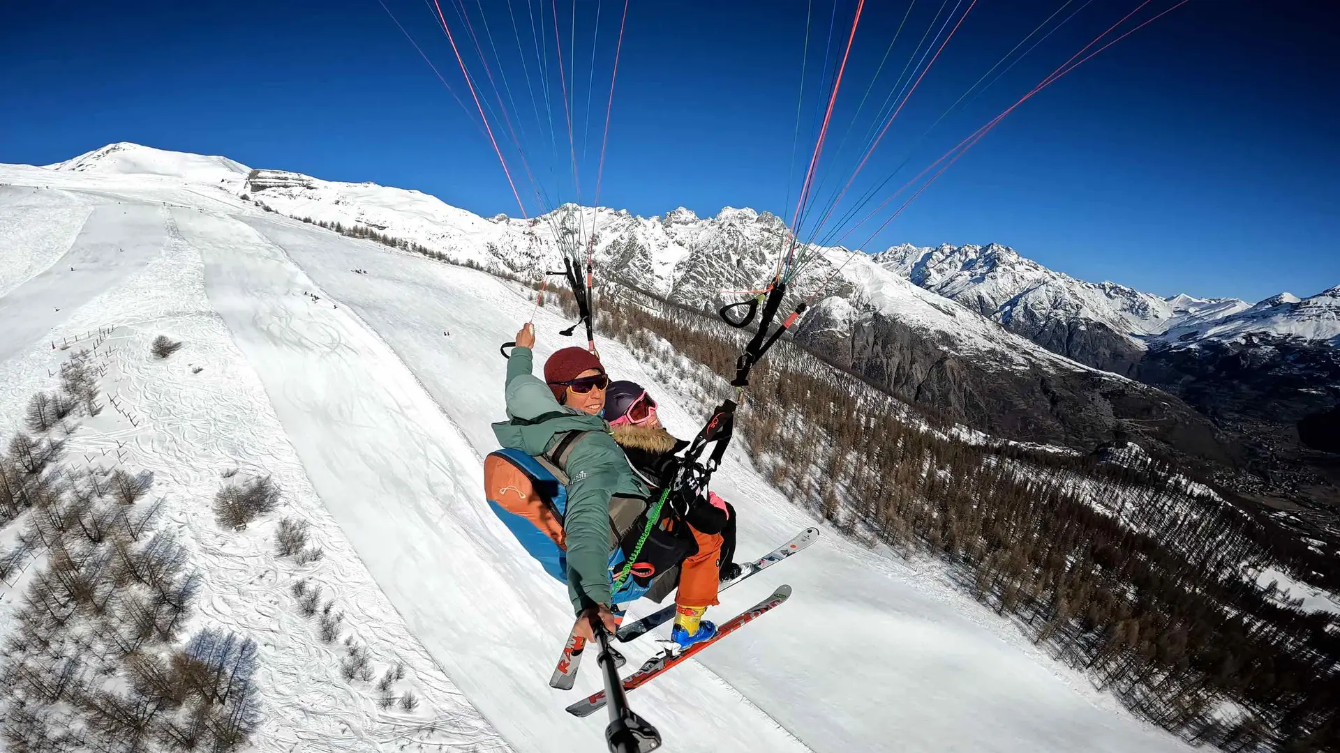 Paragliding with skis discovery flight. Fly over the Puy Saint Vincent resort and La Vallouise.