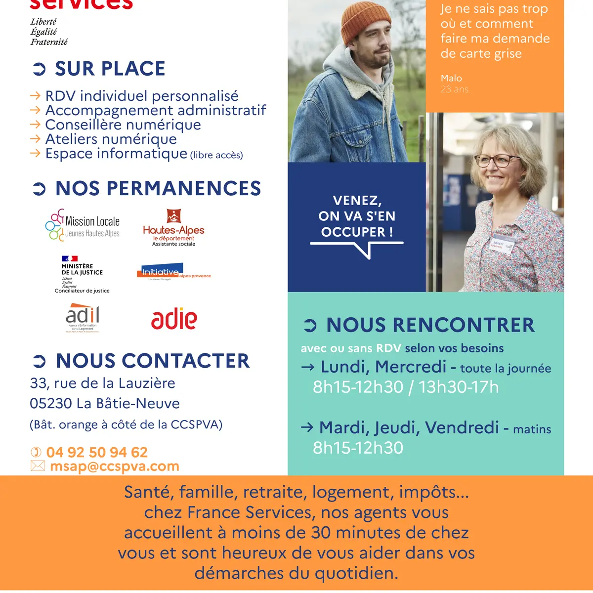 A one-stop administrative service, France Services offers the possibility of being welcomed by an agent, obtaining information and carrying out administrative procedures relating to several administrations or public bodies, all in the same place. This service is managed by the Communauté de Communes Serre-Ponçon Val d'Avance.