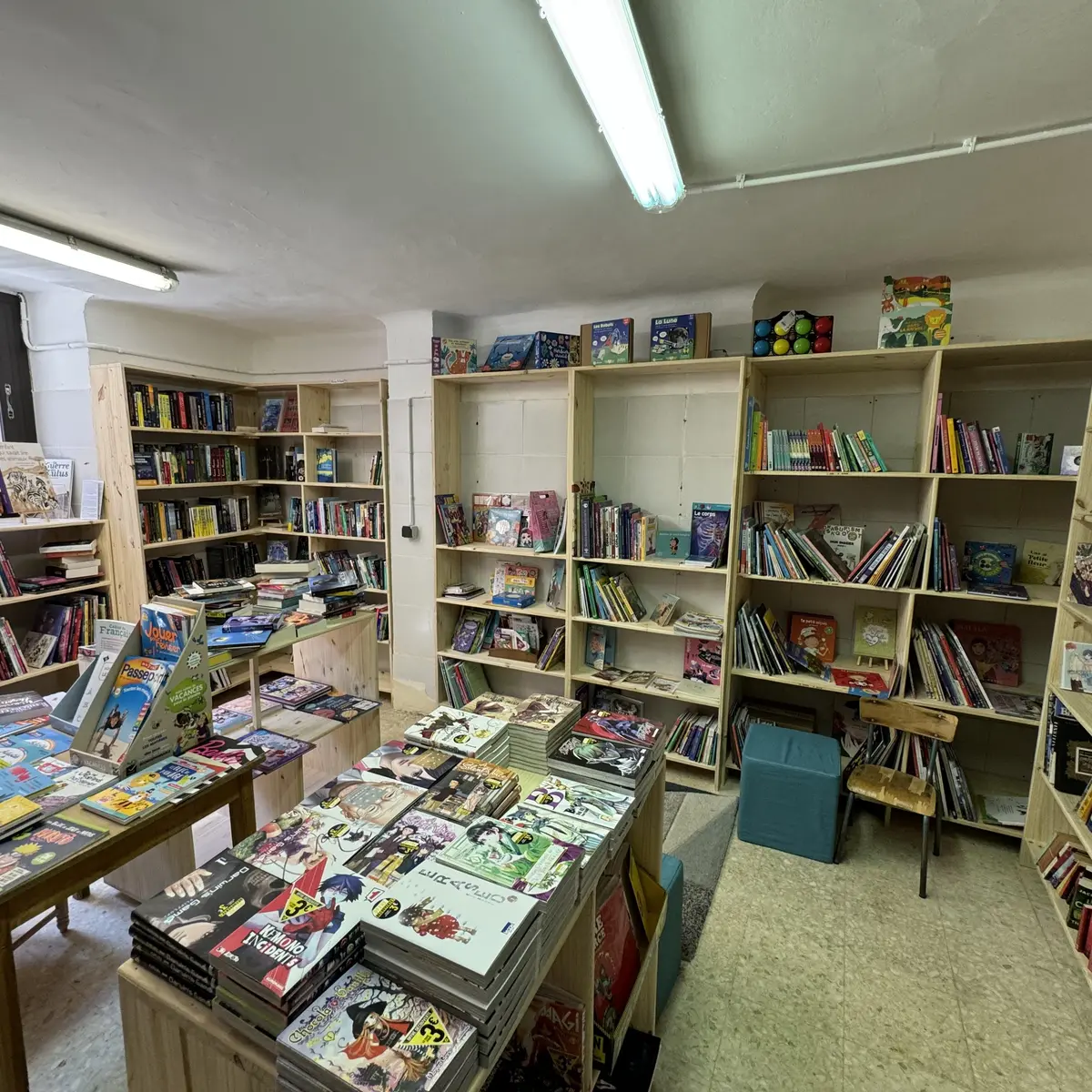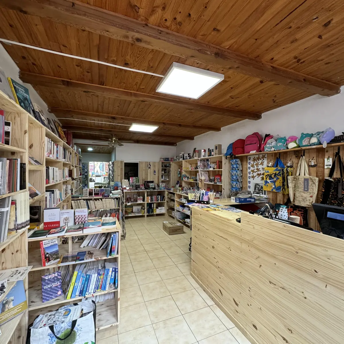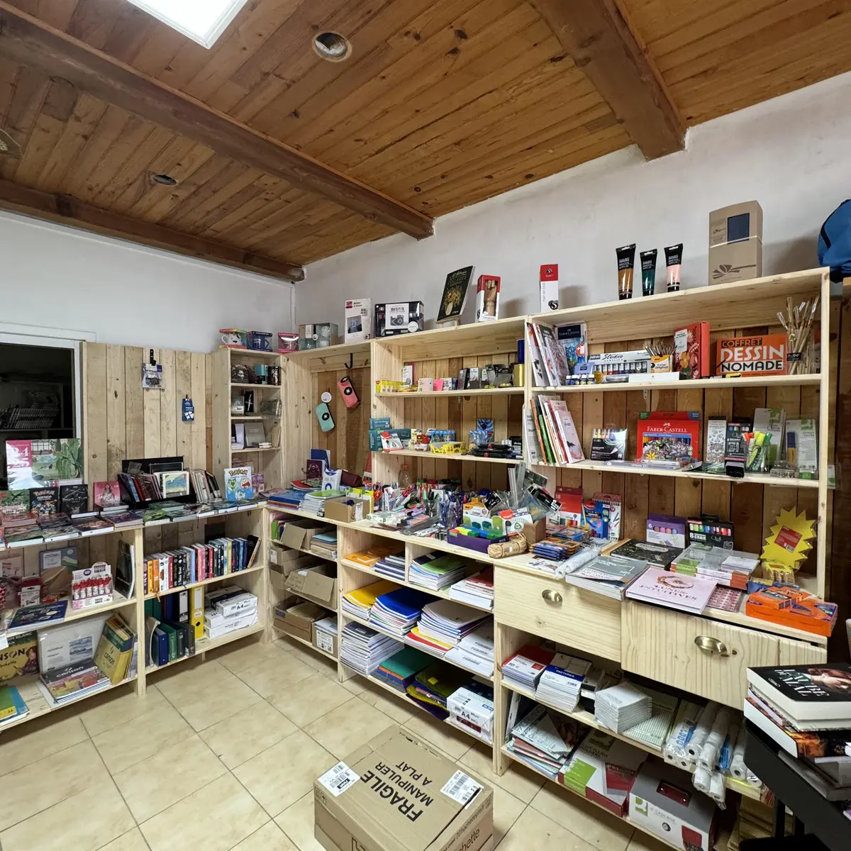 A large selection of books, stationer's, supplies, toy, DVD's, CD's, vinyles, seconde-hand books, arts, postal cards, stamps, road maps, IGN maps and topographical guides.