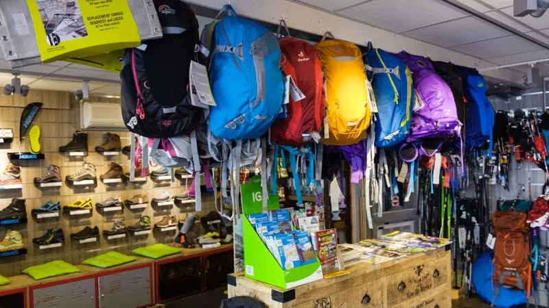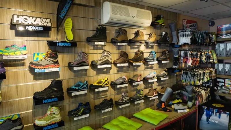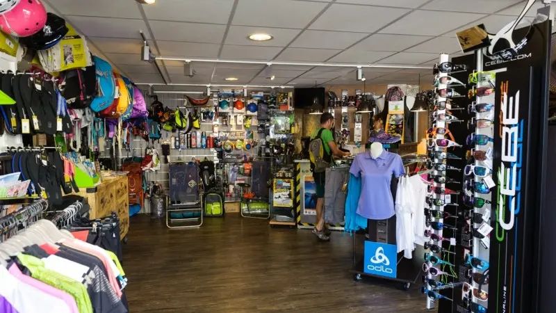 Textiles (Vaude, Uyn...), equipment (Leki, Osprey, Hydrapack, Thermos, Jetboil...), running/ trail/hiking shoes (Hoka, Scott, Dolomite, Lowa, mizuno, Asolo...)
