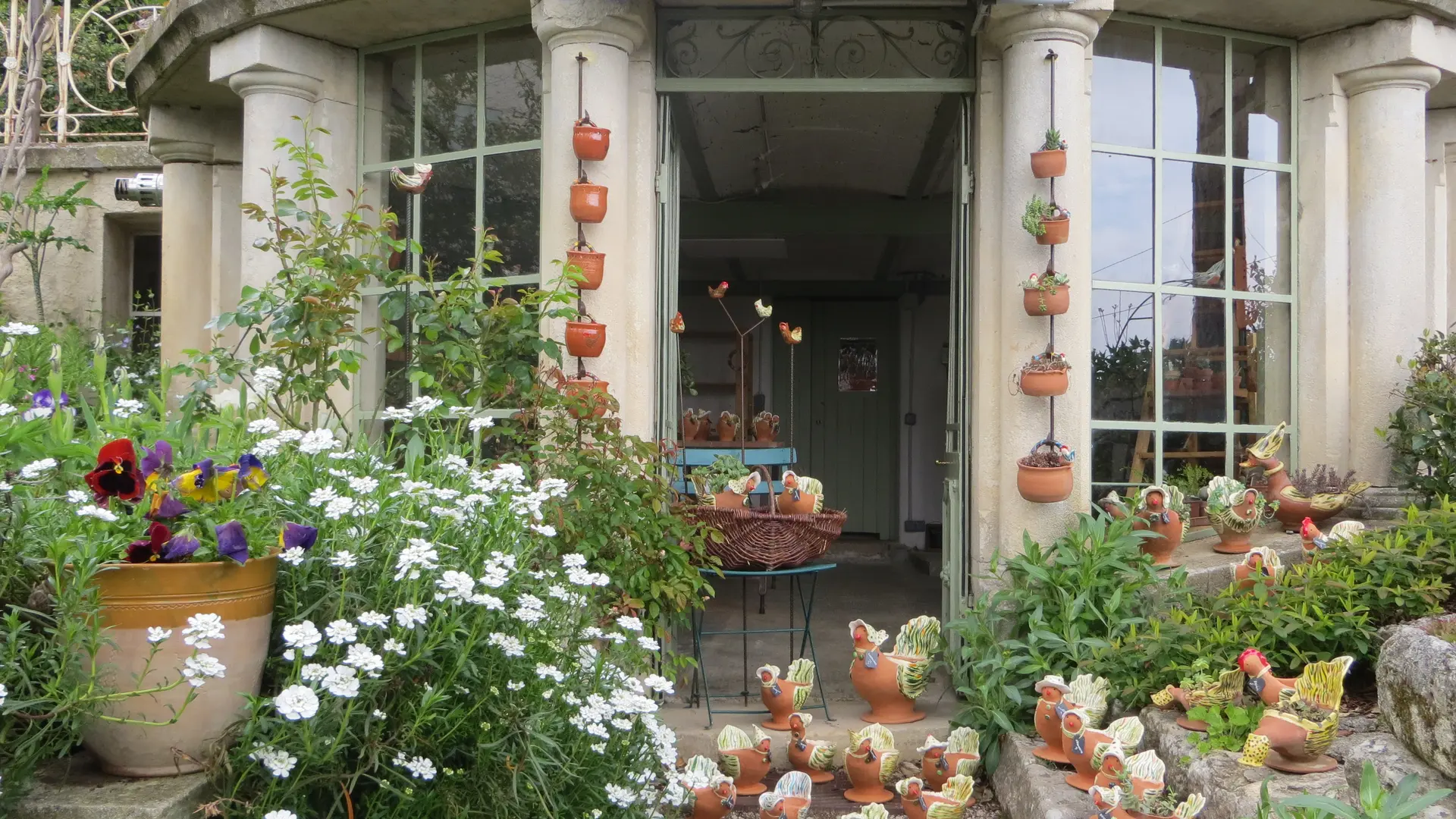 Glazed earthenware pottery. Unique pieces in chamotte clay, decorated with engobe. Garden or balcony pots in the shape of roosters, hens, geese, ducks...