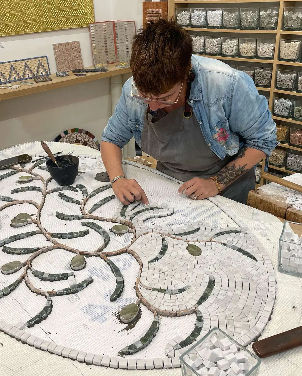the laying of poured granite or 'Venetian terrace' flooring and the production and laying of wall mosaics and paving.