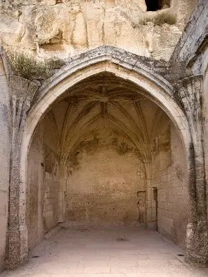 The chapel is at the entrance to the Château des Baux de Provence. Although it was originally dedicated to the Virgin Mary, it has been dedicated to Saint Catherine since the 15th century. The castle chapel was within the surrounding walls which symbolically protect the entrance to the Château, as was common in the Middle Ages. The building set vertically to the small ditch, remains of which can still be seen, was part of the Château; on the first level, that of the courtyard, it housed the castle chapel. The gaps in the cliff reveal the existence of two levels above the chapel. On the third level are clear traces of an opening which crossed the cliff and overlooked a small balcony; to the east this balcony overlooked the entrance to the 'hare hole' and was part of of its defence. On the second level, this building also had an corbel construction projecting over the small ditch. This was also part of the defence system. The 1426 inventory confirmed the existence of a 'chamber' above the chapel, but it seemed to have only a secondary role, as its development was minimal at the time of this inventory. It was very close to the entrance to the small ditch. The castle chapel opened onto the courtyard to the right of the château entrance; it is known as a 'gateway' chapel, as it welcomed visitors as soon as they arrived. However, it could be accessed directly from inside the château. This structure is particularly important for appreciating the size of the mediaeval château, as it is the only one to contain remains of 12th century Romanesque art from the former 'Sainte Marie' chapel. This chapel underwent major restructuring work during the Renaissance, but the original southern wall can still be seen above the facing put in place in the 16th century. The chapel became known as 'Saint Catherine', but it is not known exactly when this happened. The chapel's bell tower had been built at the top of the building, level with the gallery located on the crest of the cliff. It was restructured and now features rows of ribbed vaults with wall arches, liernes and tercerons; however, it still has its Romanesque sculptures, making it the oldest testimony currently visible at the Château des Baux de Provence.