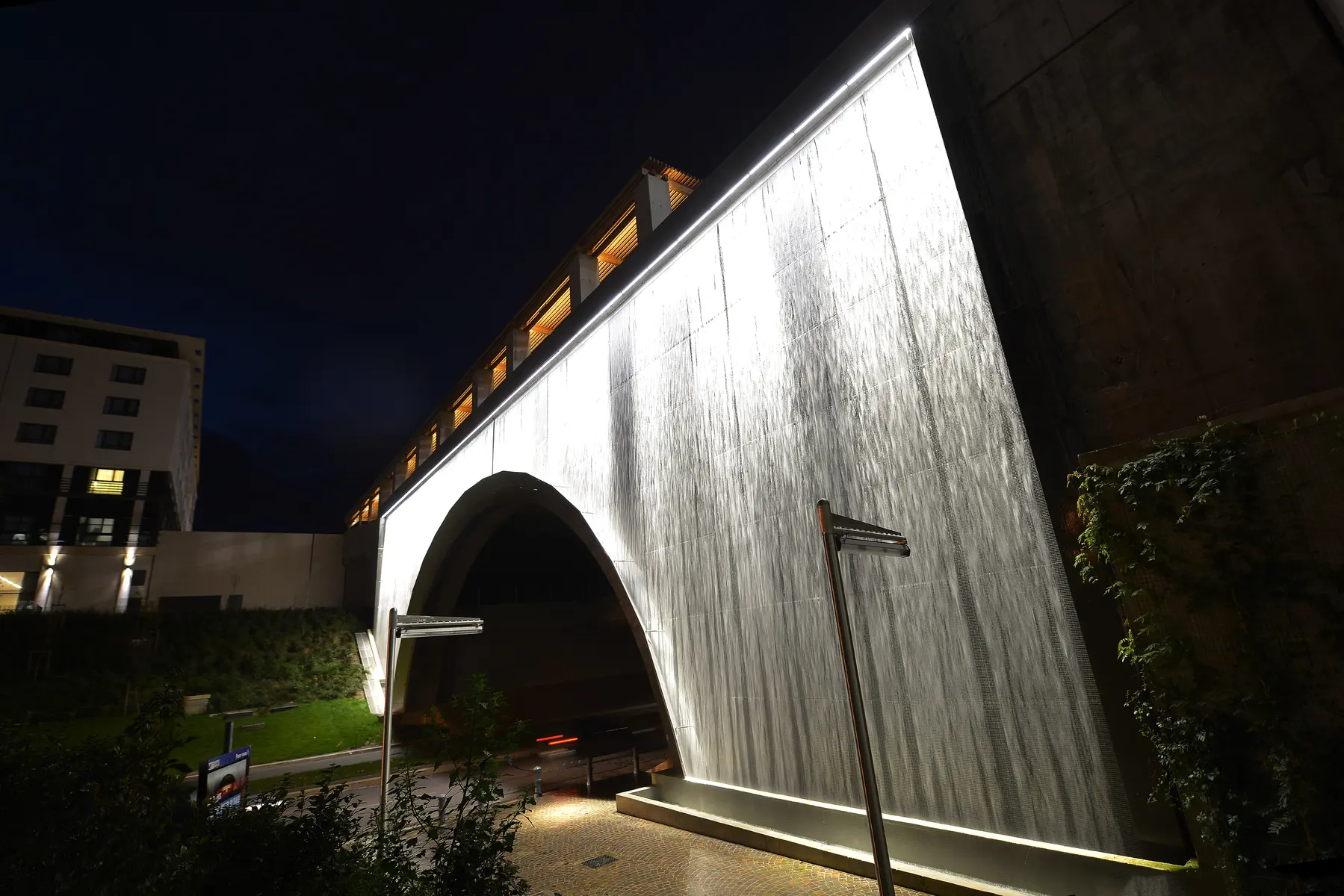 Occupying 700 m² at the town entrance and displaying 17 meter waterfall, it is the largest urban water wall in Europe.