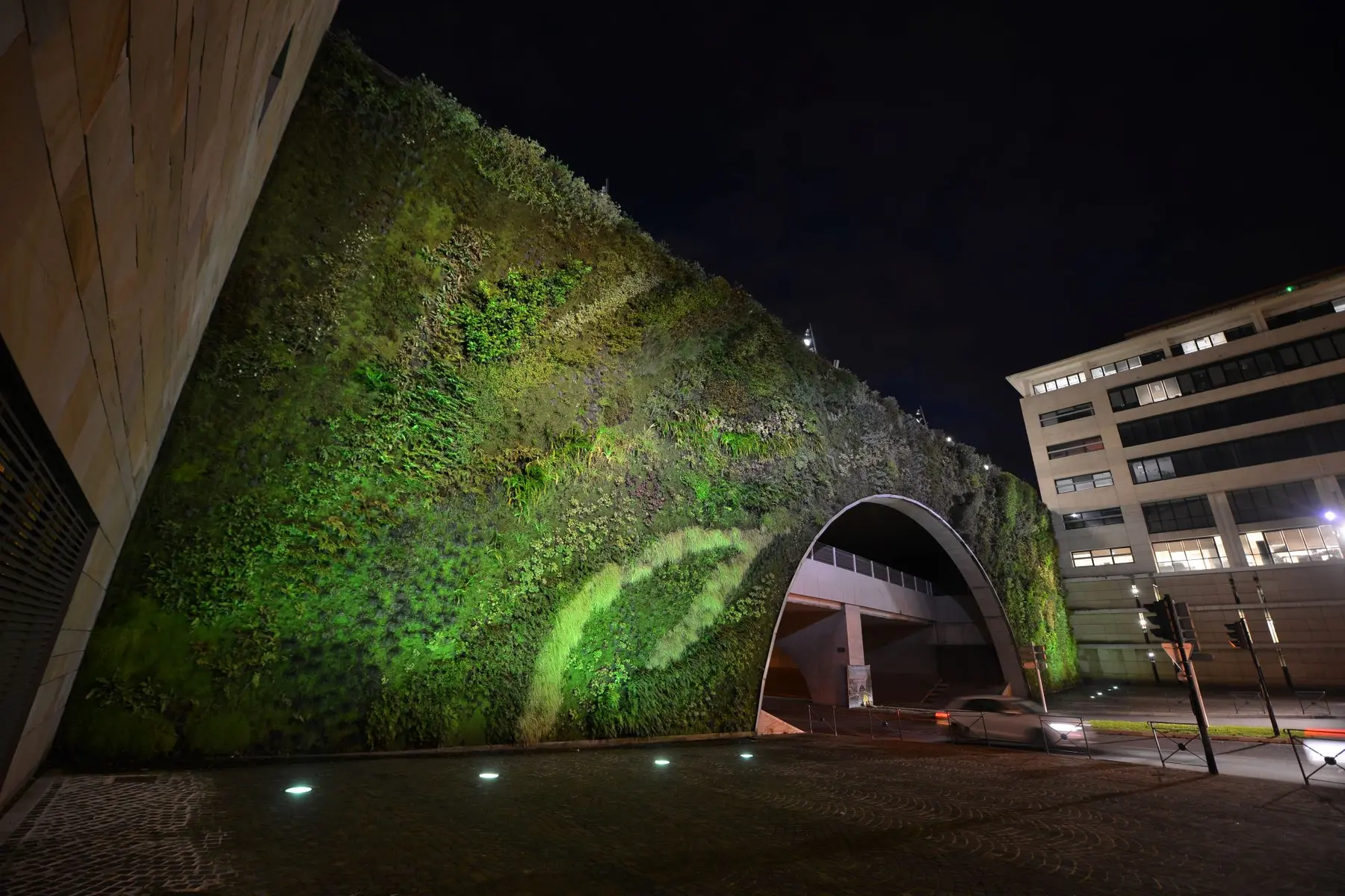 The bridge, located not far from the conservatory, features on each of its sides the largest water wall in Europe and an imposing green wall.
