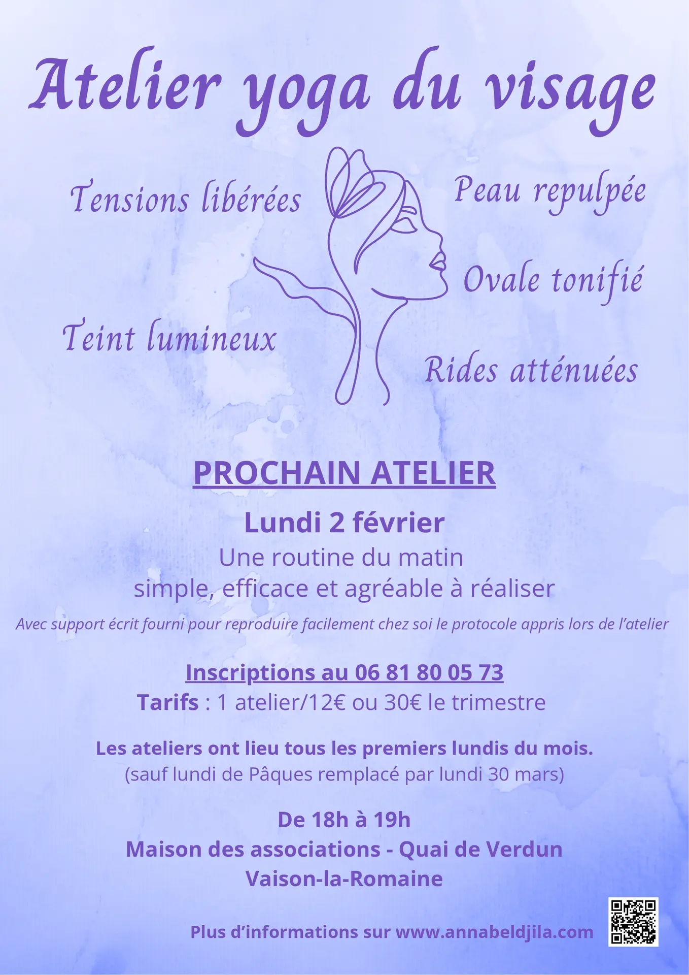 Restore a serene, luminous and toned face with facial yoga! Come and discover a simple, effective and pleasant morning routine. Written support provided at the end of the workshop so you can easily reproduce the protocol you've learned.