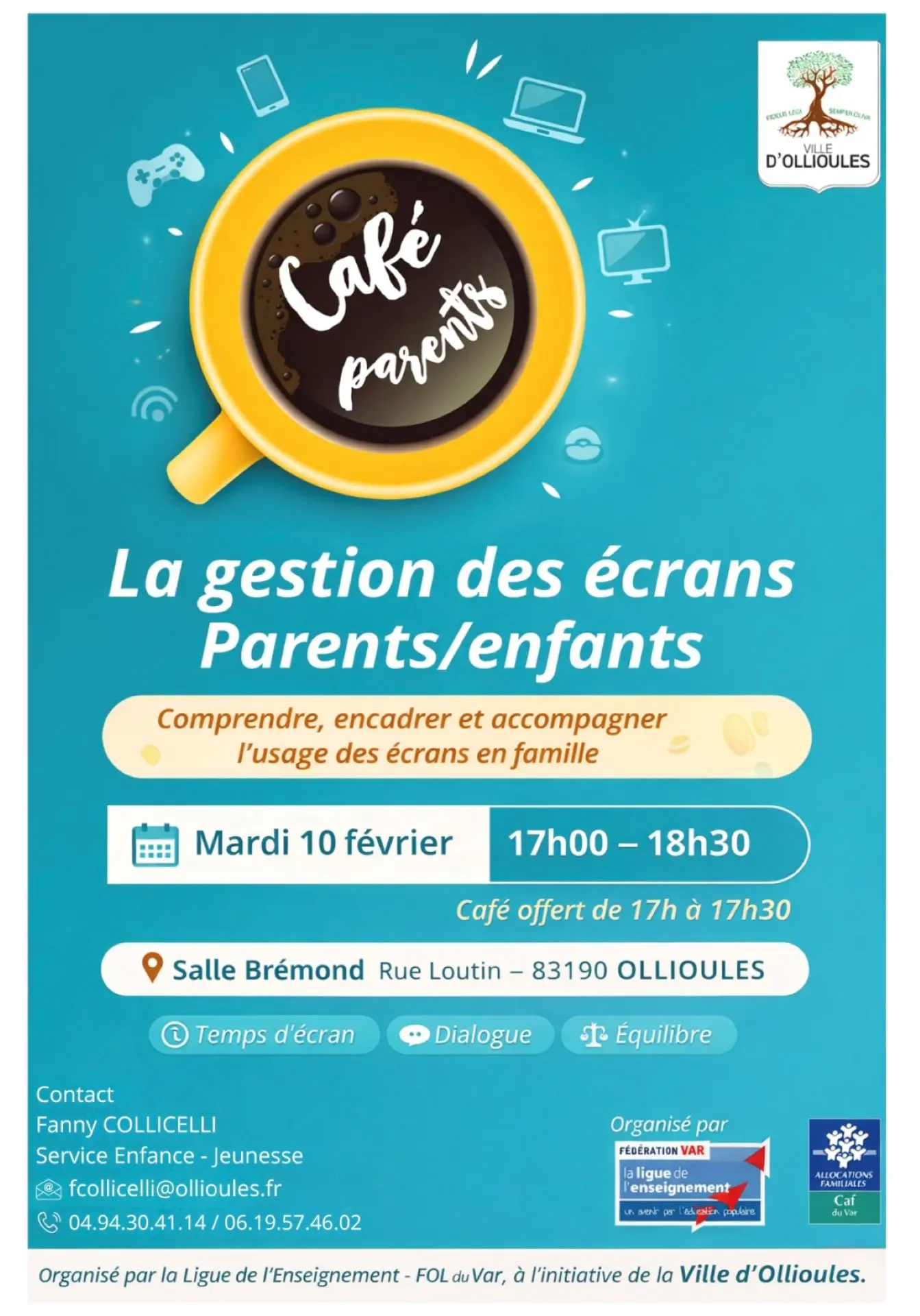 The Ligue de l'Enseignement - FOL du Var, at the initiative of the town of Ollioules and in partnership with the CAF, invites you to a Café Parents, a time for friendly, practical exchanges between parents, led by professionals.