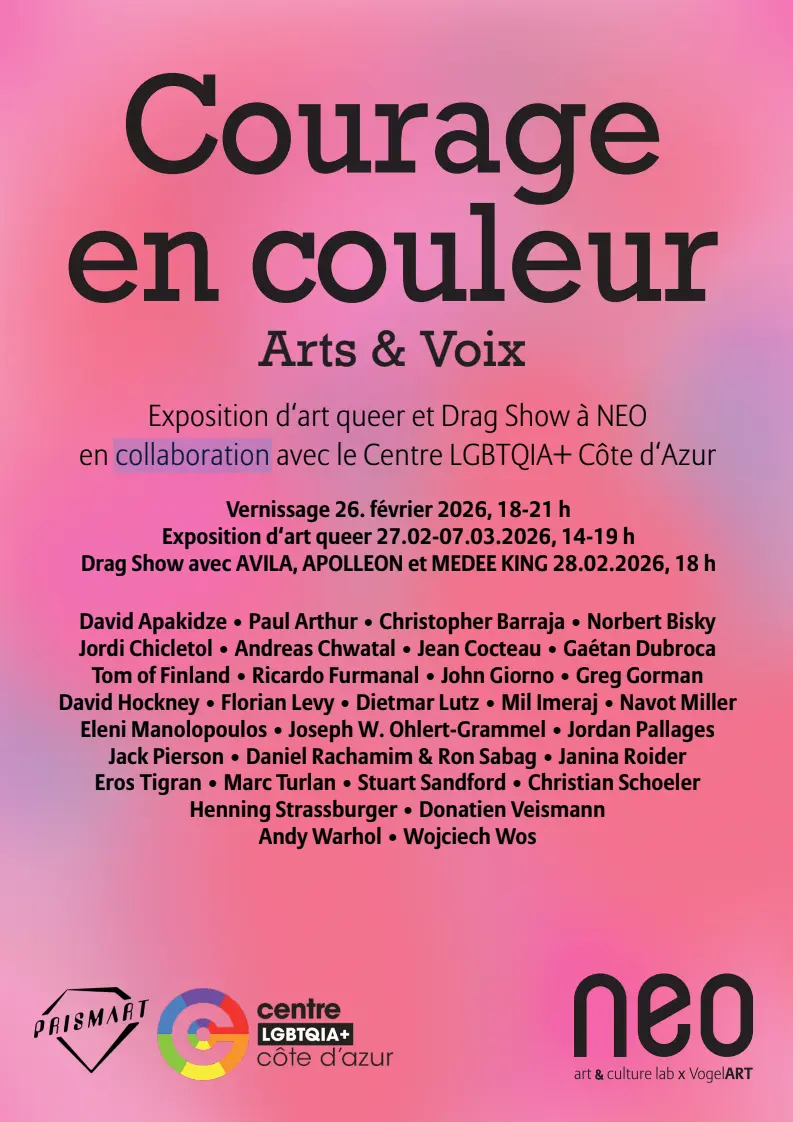 Courage in Colour - Arts & Voice is a queer art exhibition and drag show at NEO art & culture lab x VogelART in Nice, produced in collaboration with the LGBTQIA+ Centre Côte d'Azur, Prism'Art and VogelART.