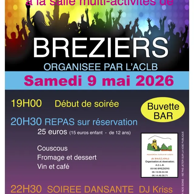 19H00 start of the evening 20H30 Meal by reservation only Couscous - cheese and dessert - Wine and coffee 35 euros 22H30 Dance evening with DJ Kriss free entry