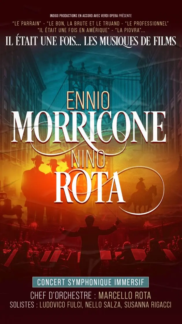 Under the direction of internationally renowned conductor Marcello Rota, celebrated soloists Nello Salza (trumpet), Ludovico Fulci (piano), and Susanna Rigacci (soprano), who collaborated with Ennio Morricone for over 30 years and performed in more than 500 concerts worldwide, interpret masterful pieces from the repertoire. Relive key moments in their exceptional careers through film scores by Sergio Leone (The Good, the Bad and the Ugly, Once Upon a Time in the West...), Francis Ford Coppola (The Godfather...), and Federico Fellini (La Strada).