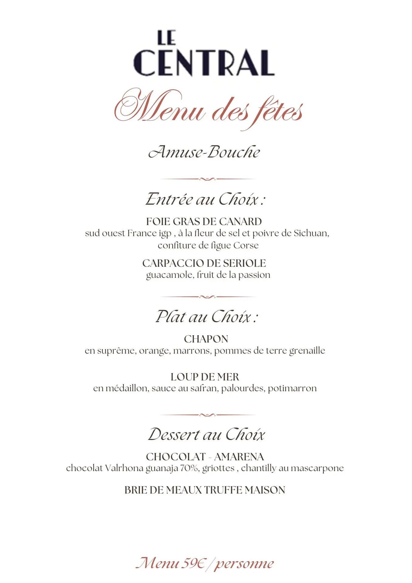 At the foot of Notre Dame Basilica, Le Central offers a special holiday menu, available from December 16th to January 3rd, 2026. Our bistronomic cuisine will delight everyone's palate; wonderful culinary discoveries await you in a retro-chic setting with a warm atmosphere. Our team will be delighted to ensure you have a convivial experience. Come and enjoy an exceptional moment to enhance the magic of the holidays.