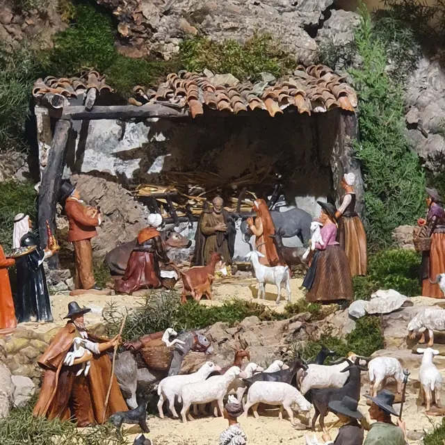 The santons are inspired by local life. Beyond the Holy Trinity, surrounded by the donkey and the ox, you'll find all the inhabitants of the village. Millers, fishmongers, shepherds. And, of course, they're accompanied by the rapturous Virgin Mary, whose arms are raised in the air to announce the birth of the Christ Child.