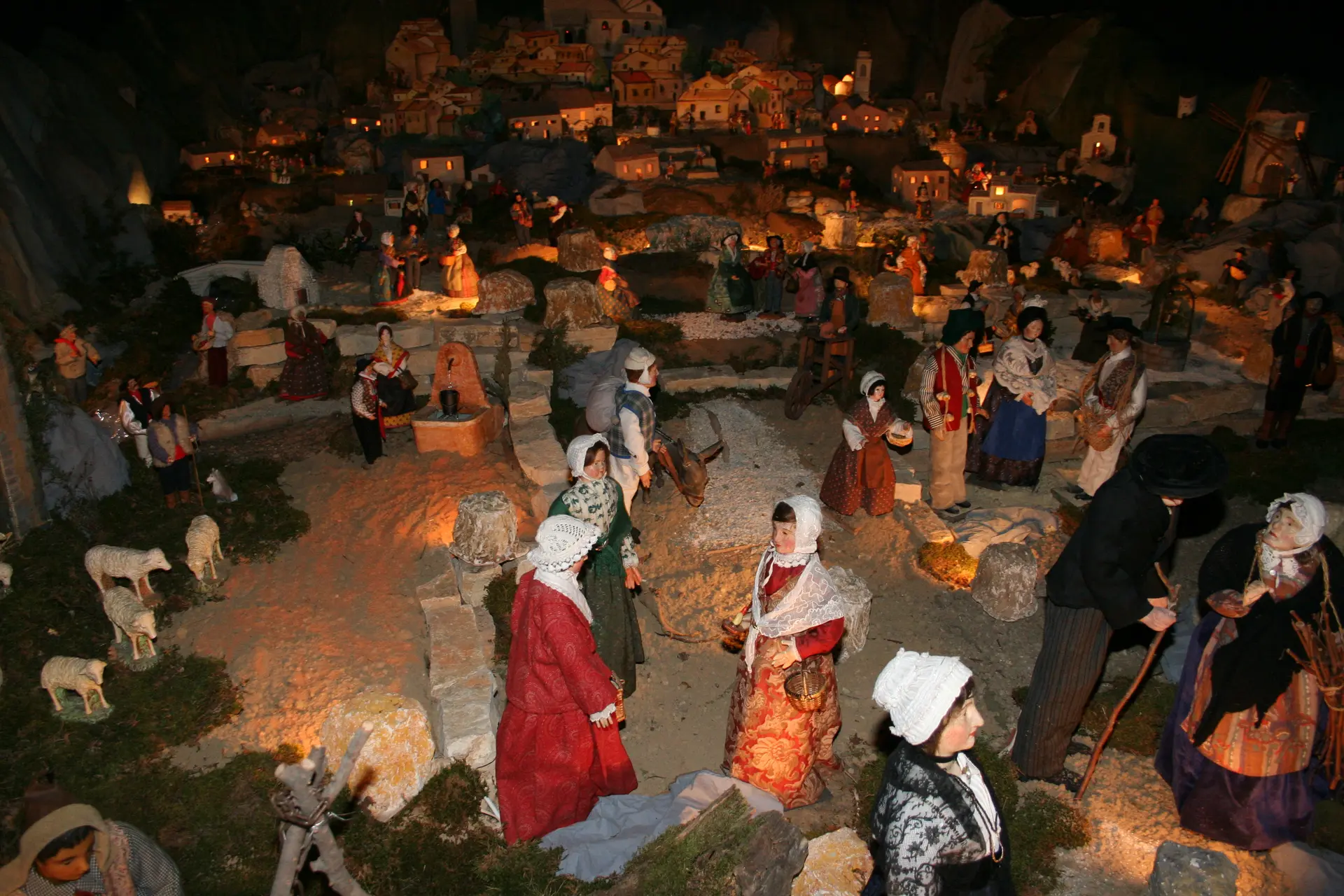 Large traditional Provencal crib on a 57 m² surface, made with beautiful old Provencal santons. Coin-operated timer (€2) for music and light.