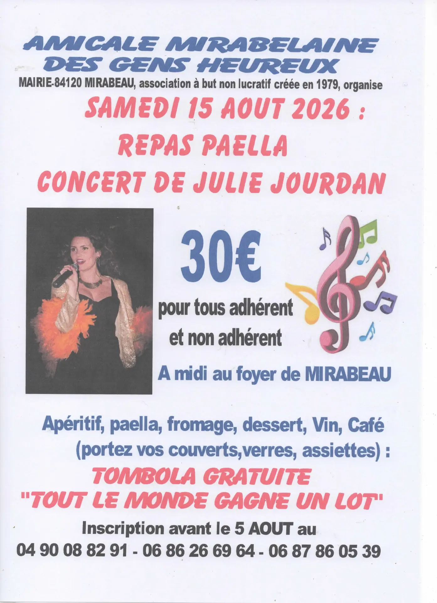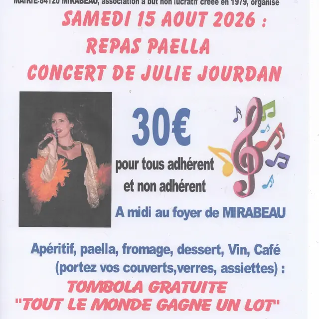 REPAS PAELLA - CONCERT DE JULIE JOURDAN - TOMBOLA GRATUITE