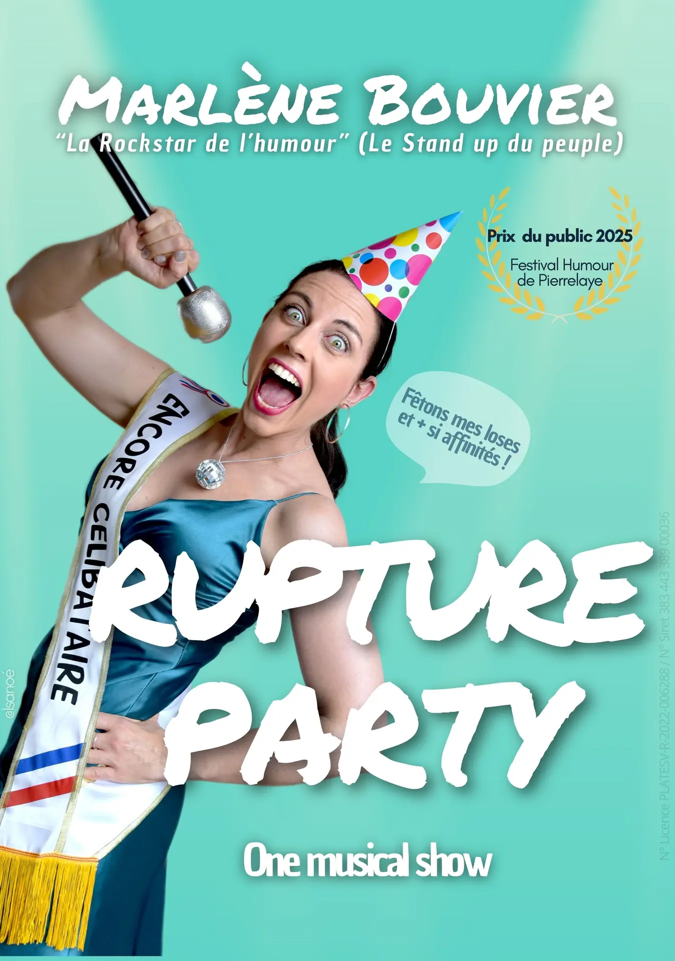 The "One musical show" by Marlène Bouvier, "La Rockstar de l'humour". Ex-institute, ex-depressive, expert in love losses, Marlène Bouvier invites you to celebrate her latest break-up with music.