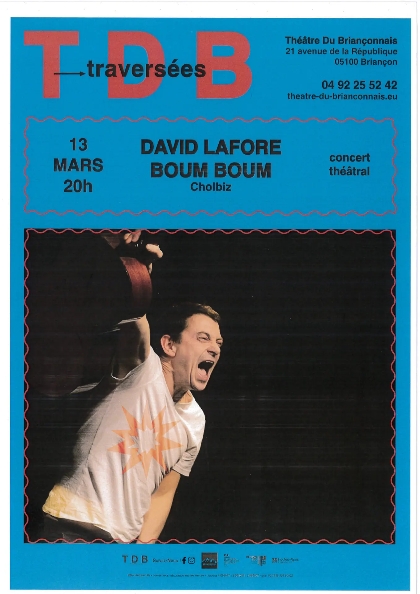 David Lafore boum boum is an explosive duo made up of David Lafore, an unclassifiable singer-performer, and Gildas Etevenard, an exalted and subtle drummer. Together, they deliver an acoustic concert that's as theatrical as it is intimate, where music flirts with the absurd, poetry and improvisation