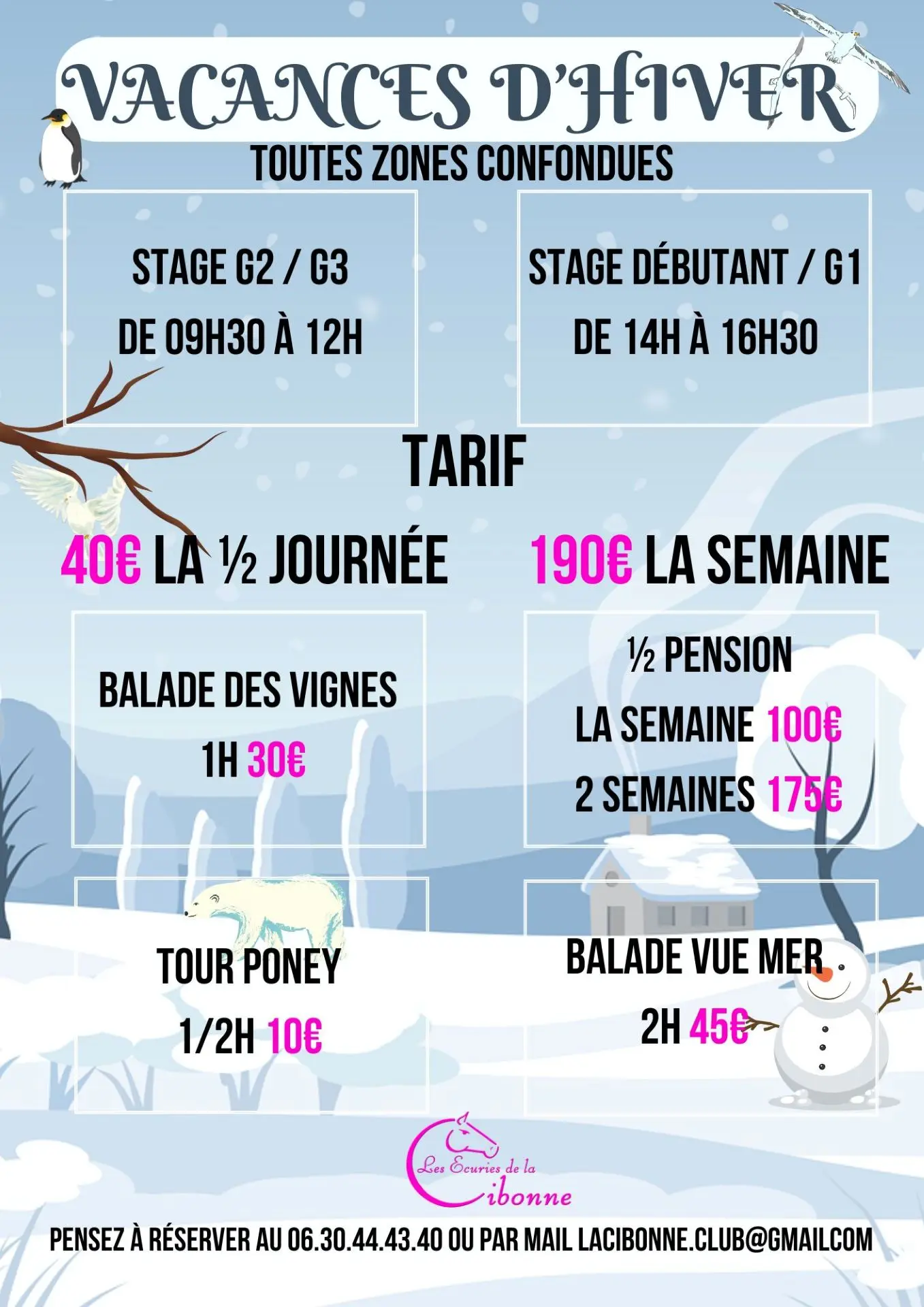 Training course, vineyard ride, pony ride, 1/2 board, sea view ride.